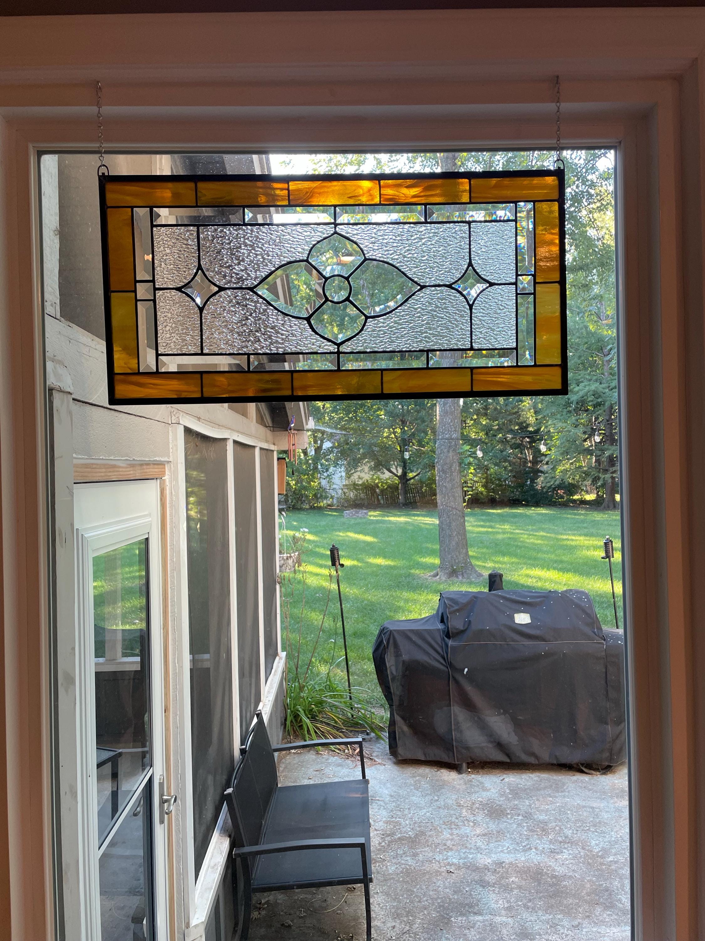 Handmade stained glass panel in wispy amber and clear granite with bevels. 12.5” x 25.5” design brings warmth and elegance to any room.