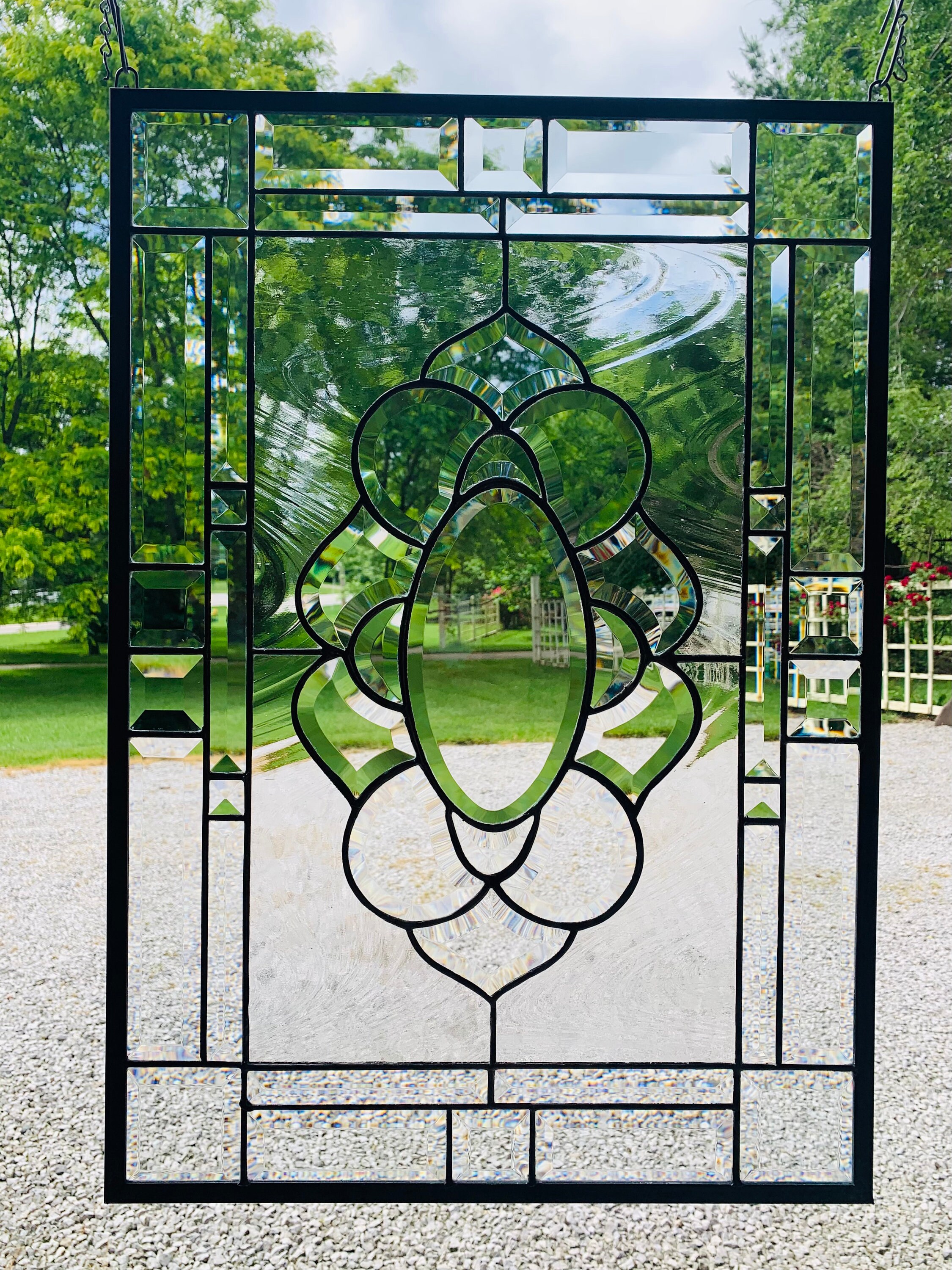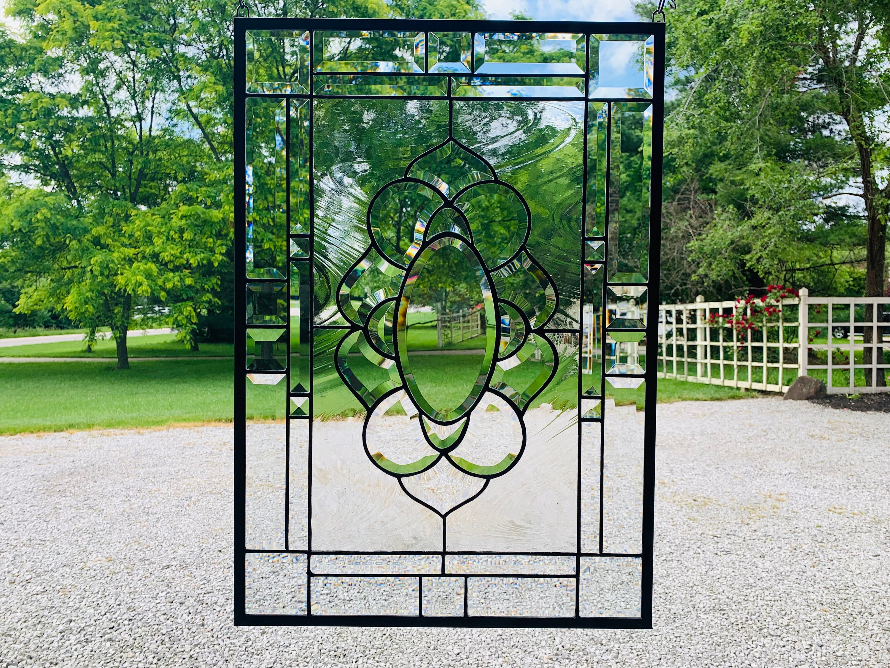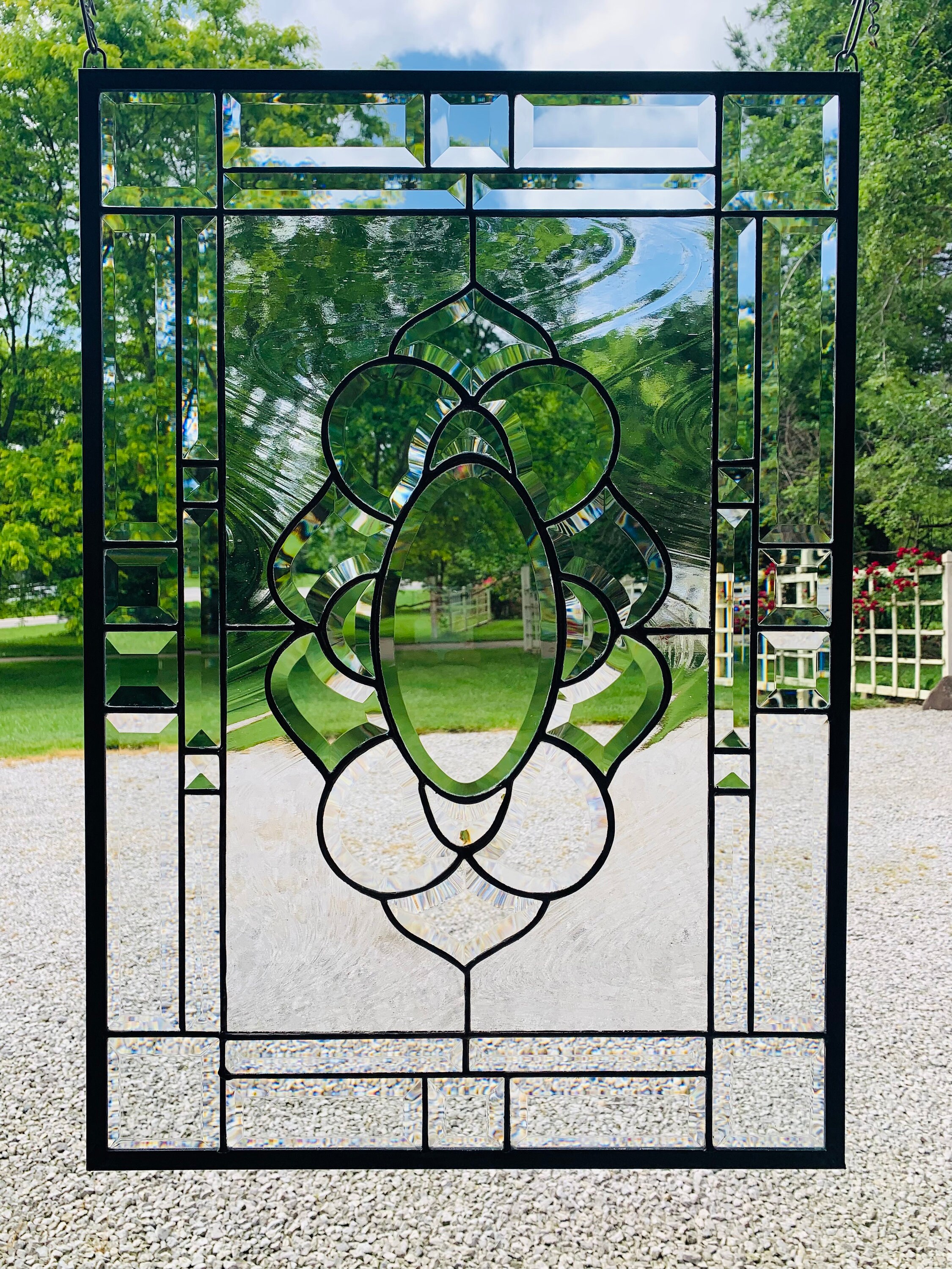 This beautiful stained glass window is made with 32 square and rectangle bevels, a beautiful 15 piece bevel cluster, and clear Baroque glass. Beveled glass is designed to catch and reflect the light creating a wonderful visual effect. The bevels act as prisms that refract the light splitting into the colors of the rainbow. The bevel cluster in the center is surrounded with a clear Baroque glass and bordered with two rows of clear beveled squares and rectangles. This lovely design provides beauty and privacy.