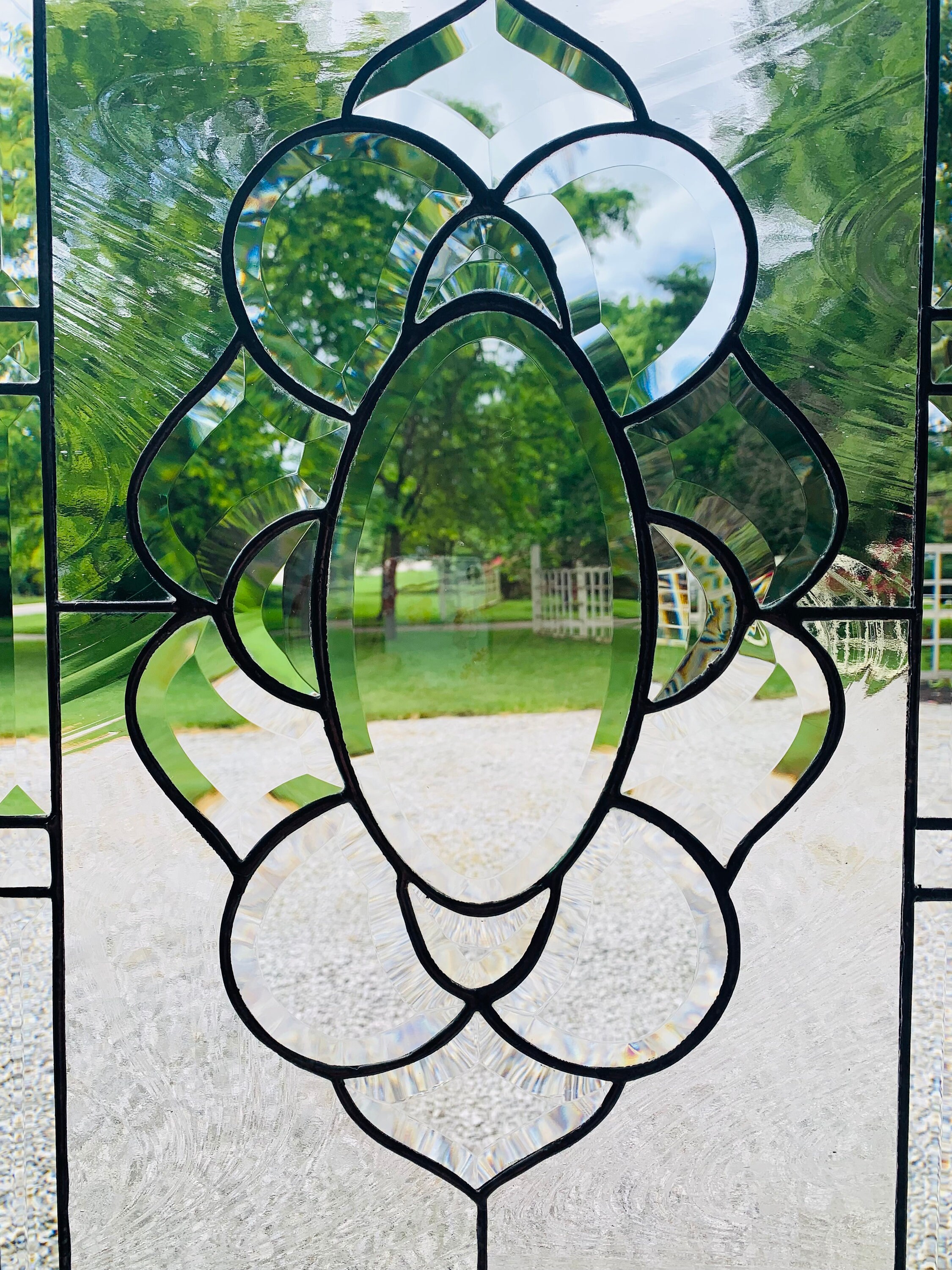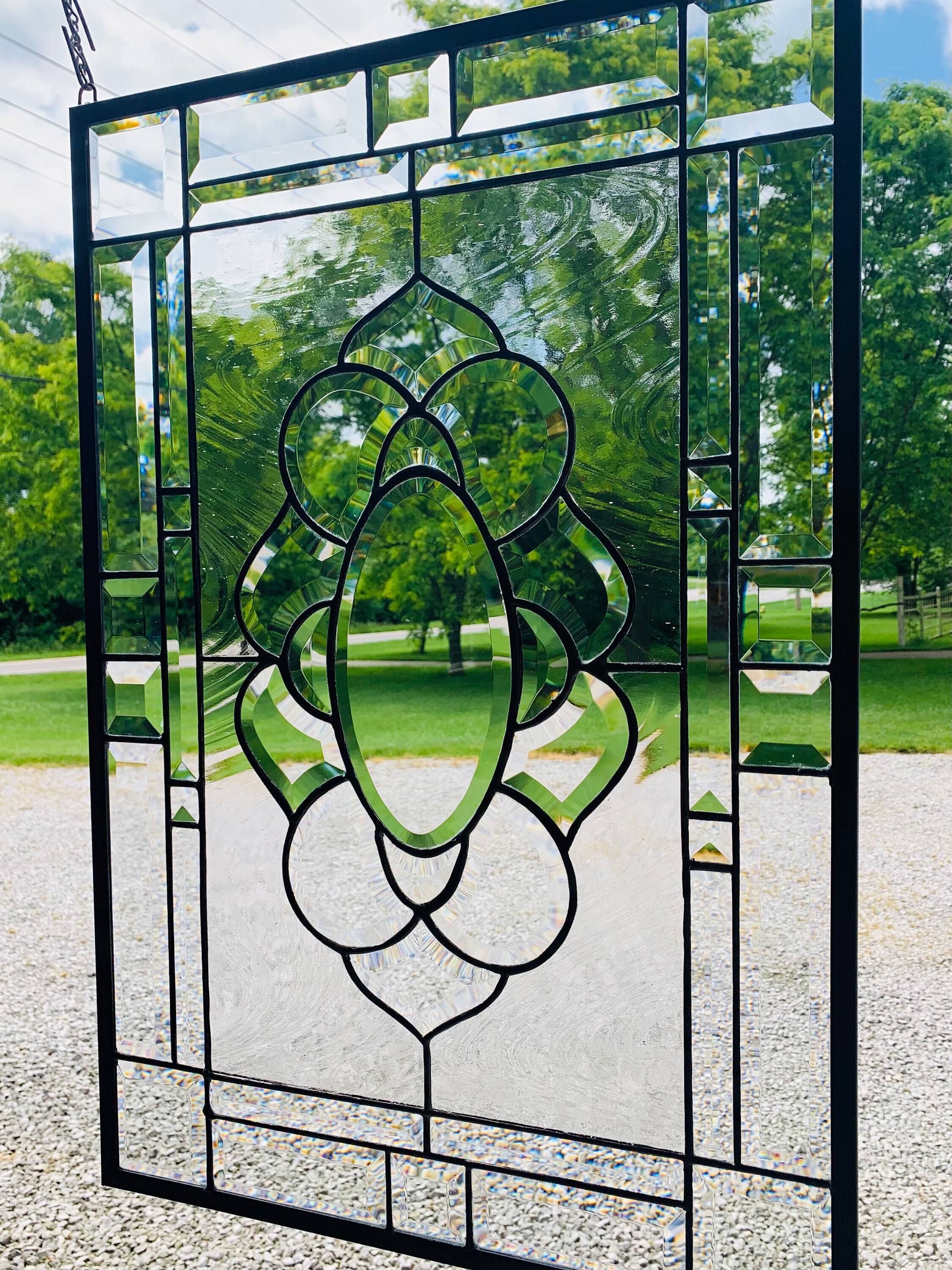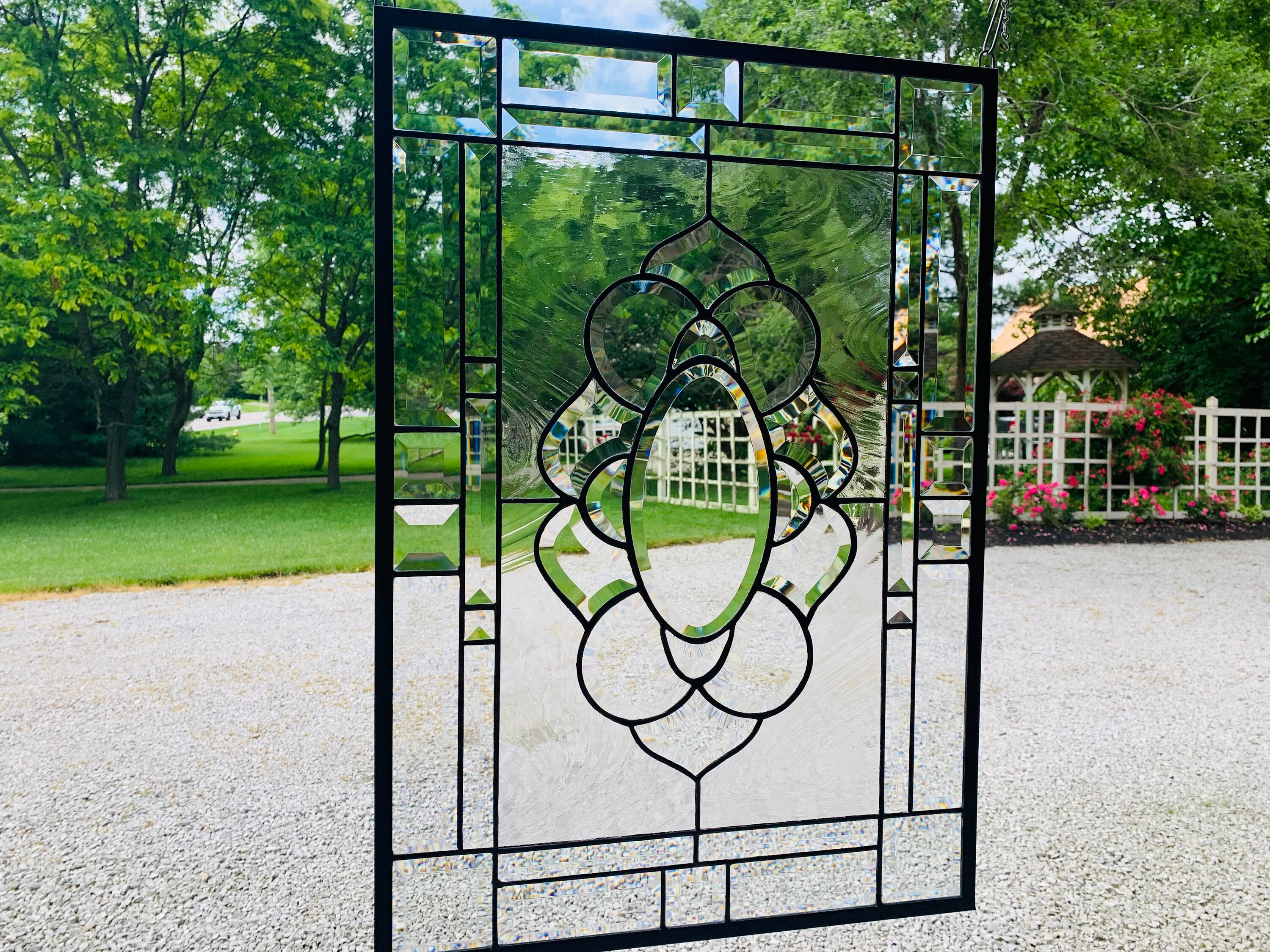 This beautiful stained glass window is made with 32 square and rectangle bevels, a beautiful 15 piece bevel cluster, and clear Baroque glass. Beveled glass is designed to catch and reflect the light creating a wonderful visual effect. The bevels act as prisms that refract the light splitting into the colors of the rainbow. The bevel cluster in the center is surrounded with a clear Baroque glass and bordered with two rows of clear beveled squares and rectangles. This lovely design provides beauty and privacy.