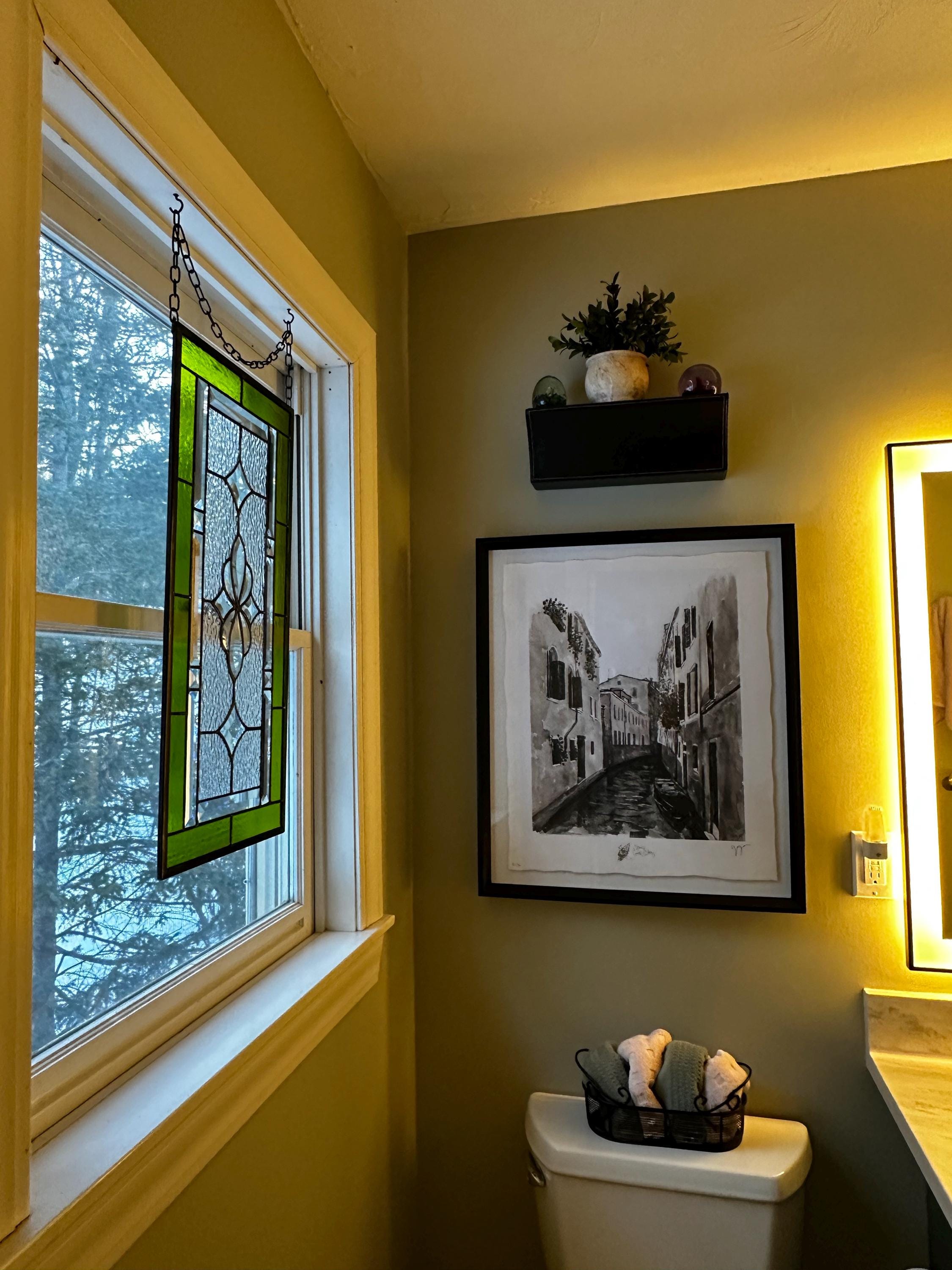 Handmade stained glass panel in chartreuse green and clear ripple with bevel accents; 11.5" x 23.5" handcrafted by Honey Dew Glass.