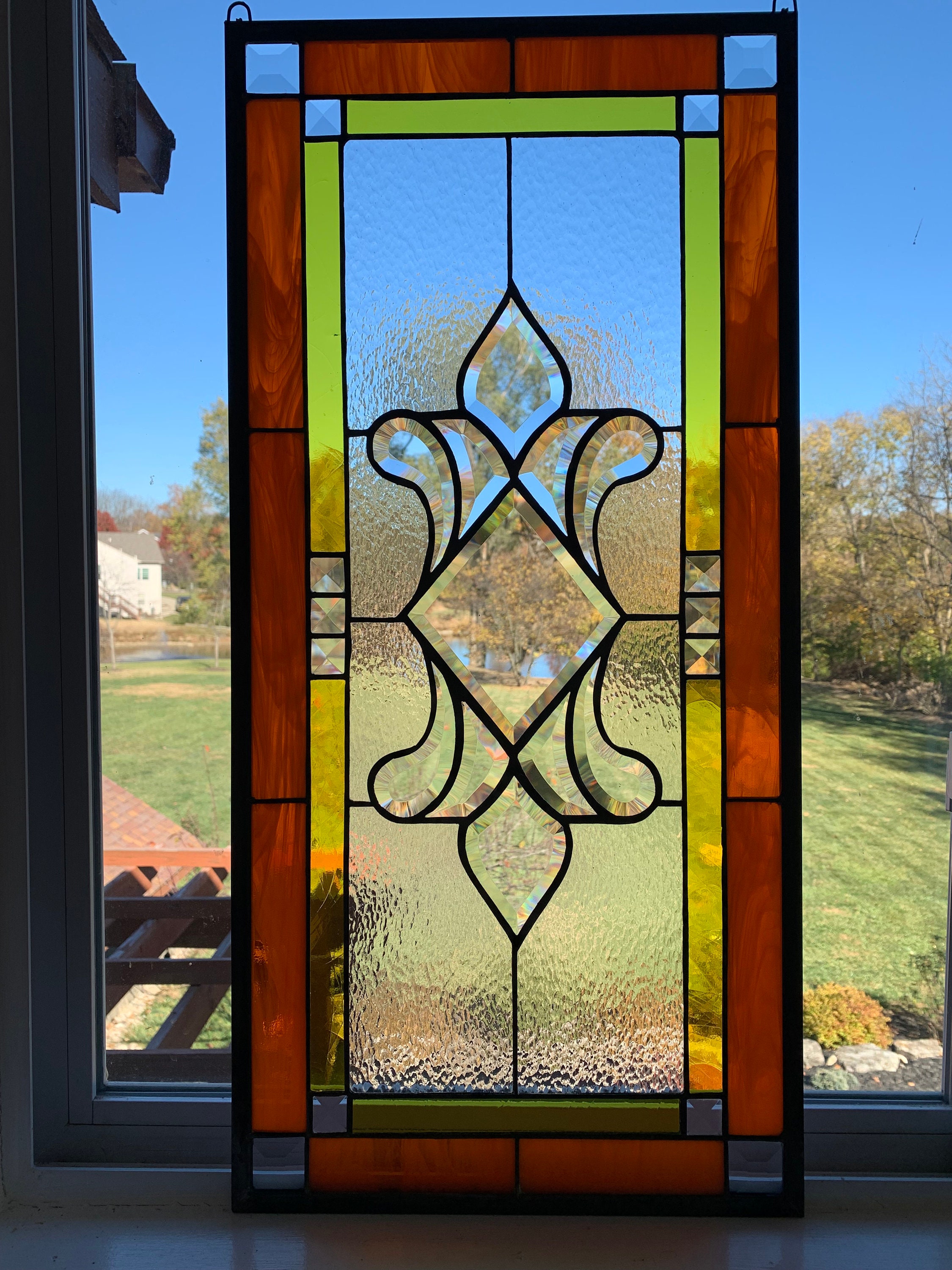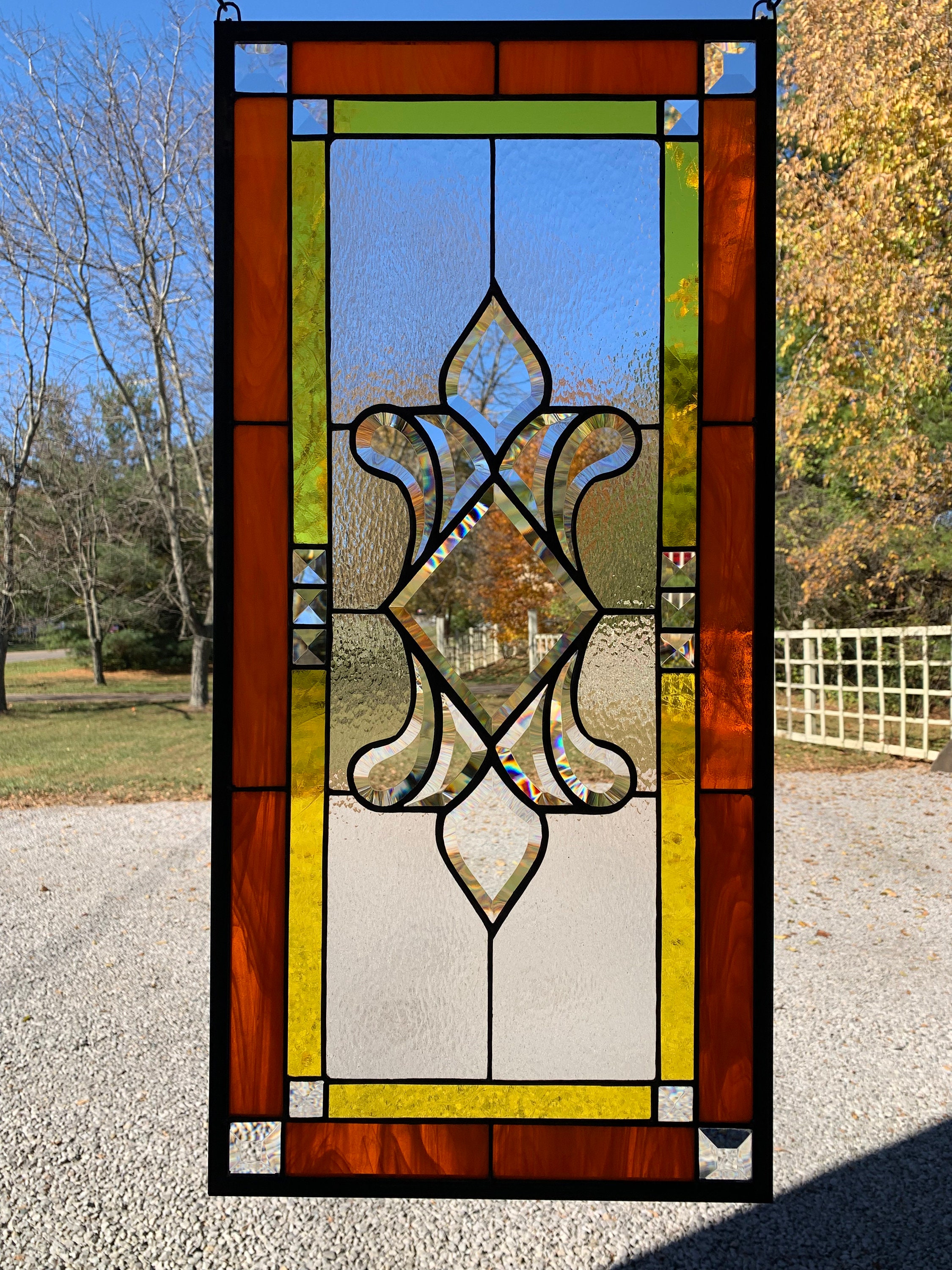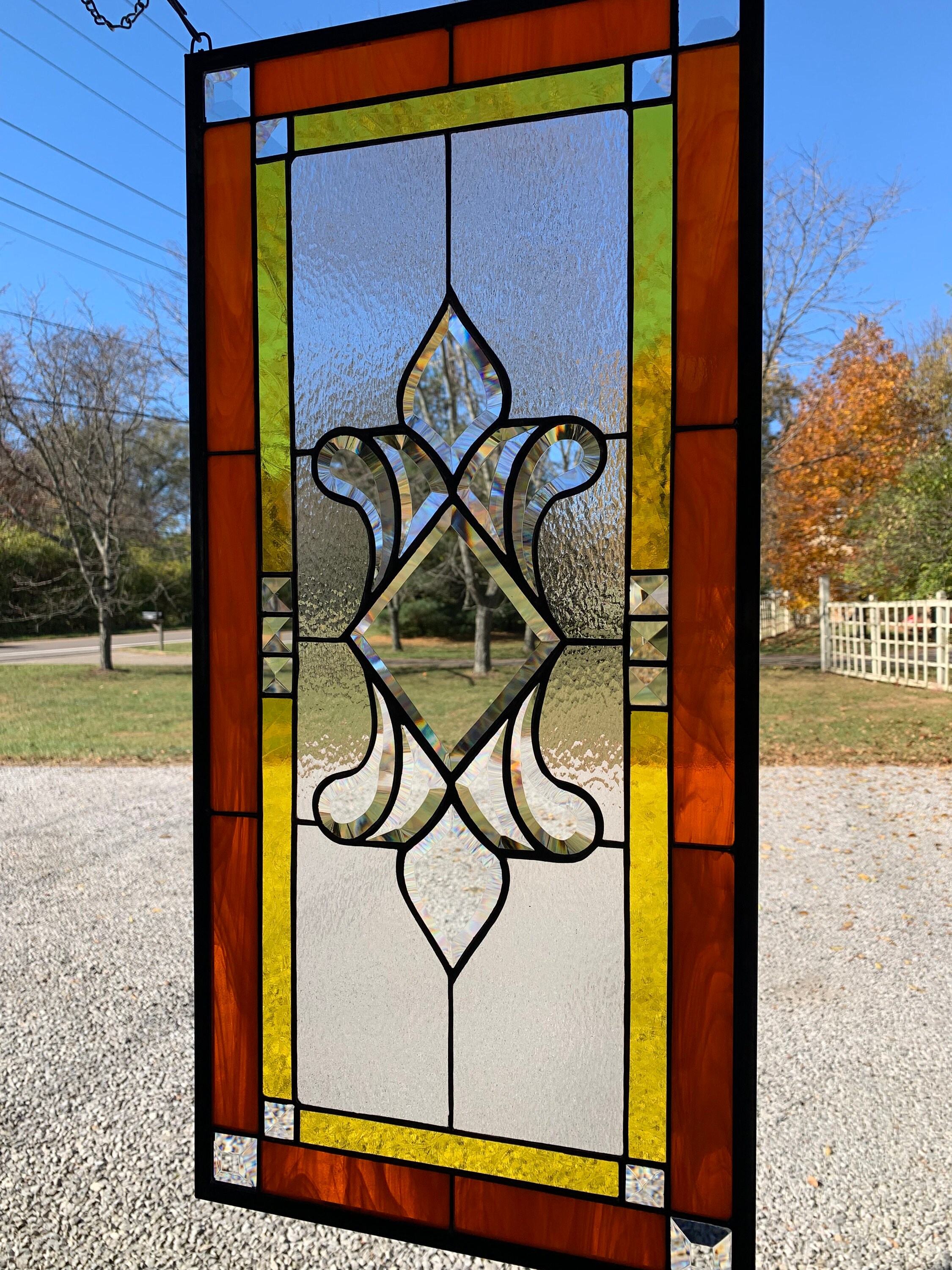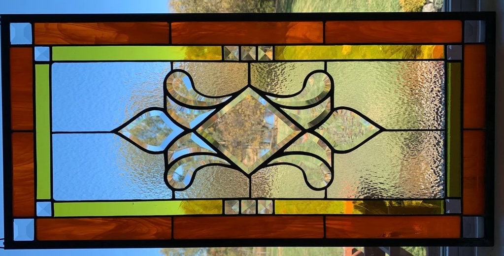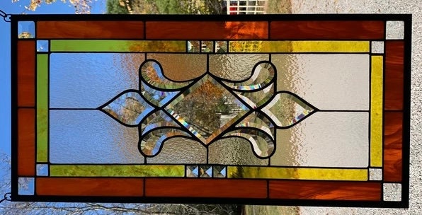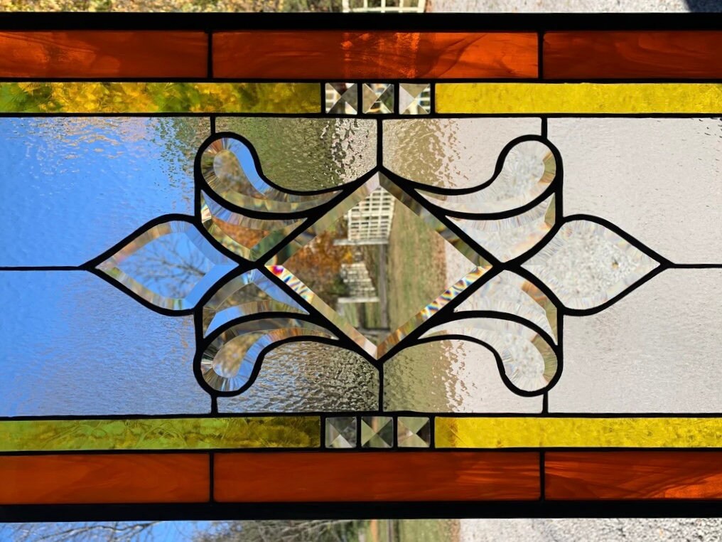 This beautiful stained glass window is made with orange wispy and antique yellow glass, clear hammered glass and bevels and measures 13.75" X 28.75”. An eleven piece center bevel cluster is used in the center and fourteen accent bevels are used around the border. Bevels create an angled surface that acts as a prism in sunlight creating interesting color diffraction.