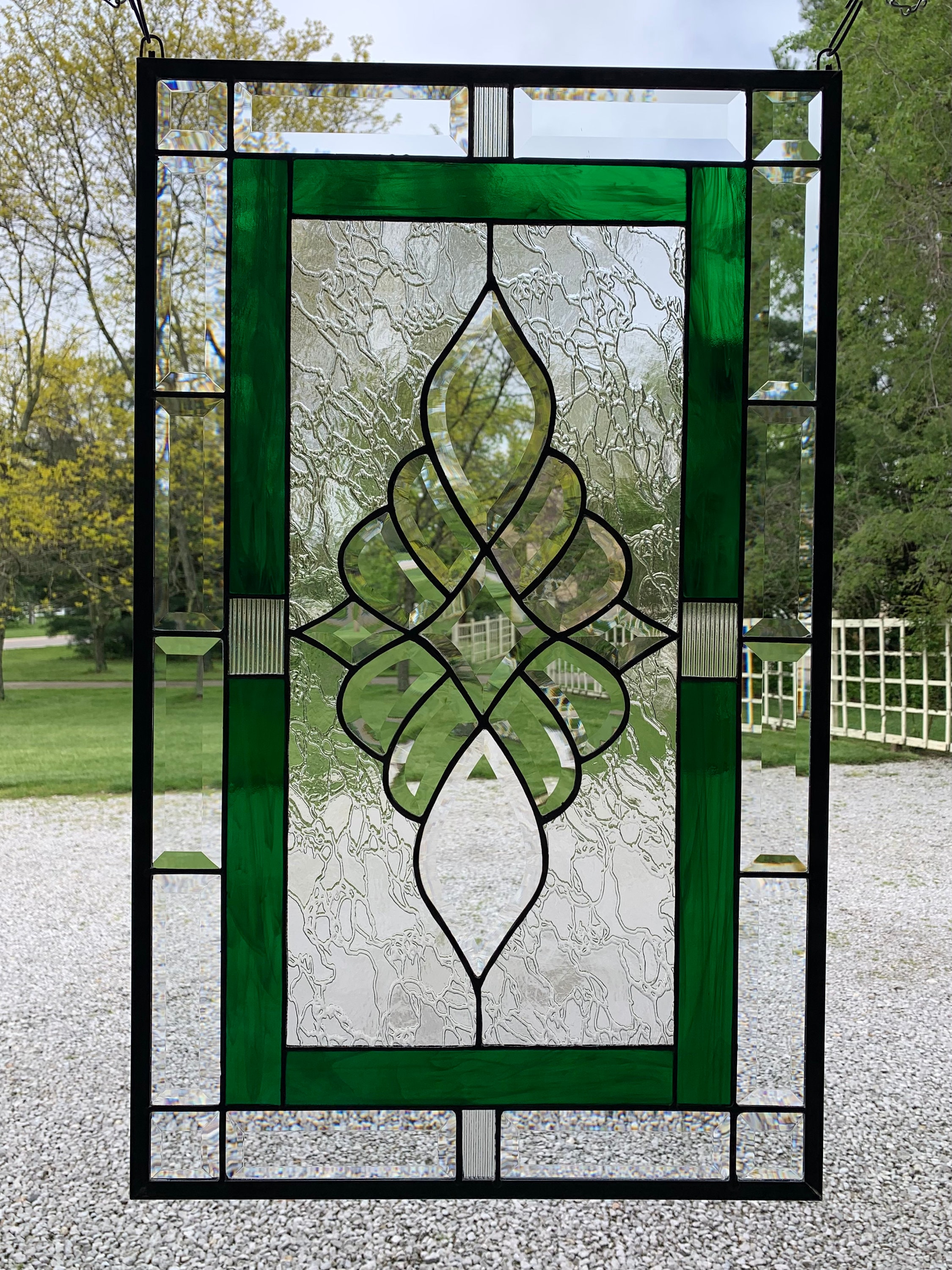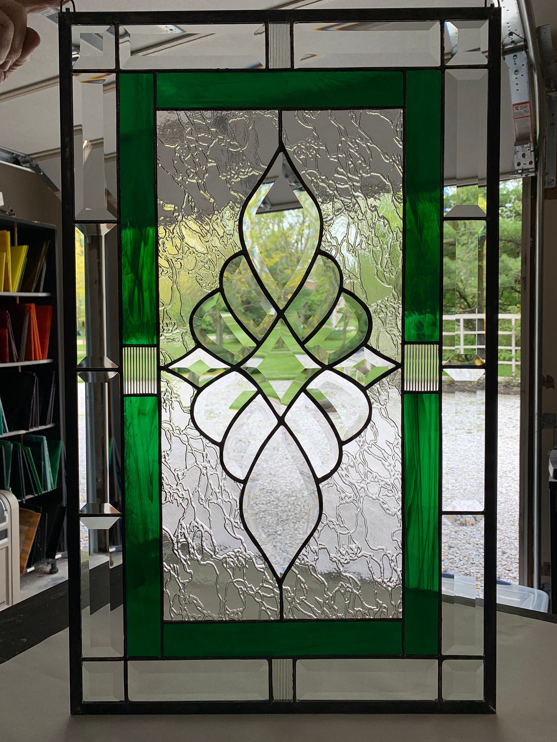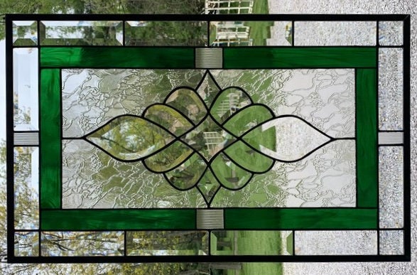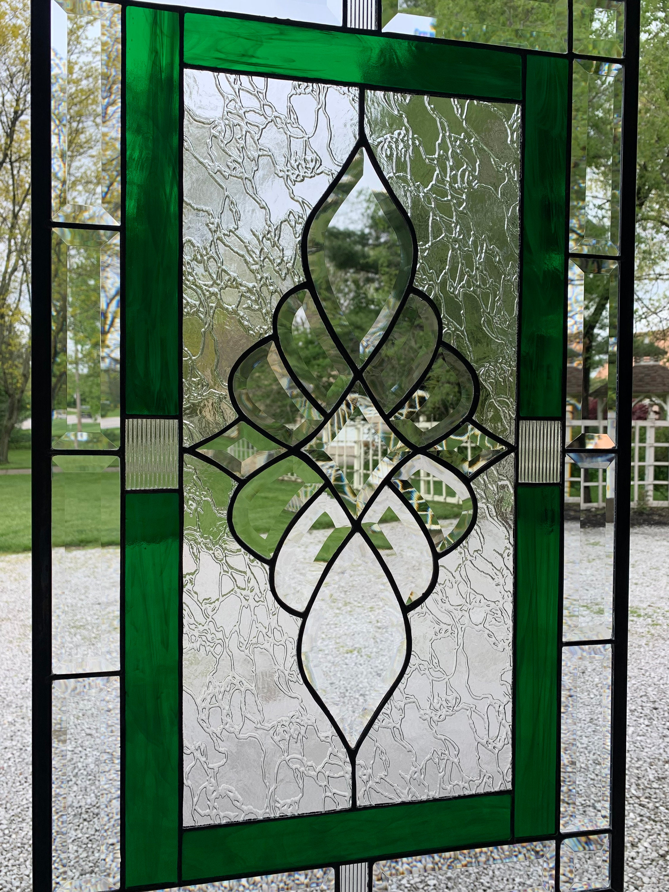 This beautiful stained glass window is made with 16 rectangle bevels and a elegant center bevel cluster. Clear delta glass is framed with a dark emerald green wispy glass and clear accents. The beveled cluster used in the center is designed to catch and reflect the light creating a wonderful visual effect. The bevels throughout the panel act as prisms that refract the light splitting into the colors of the rainbow.
