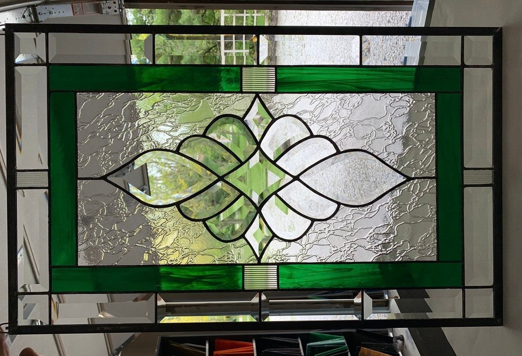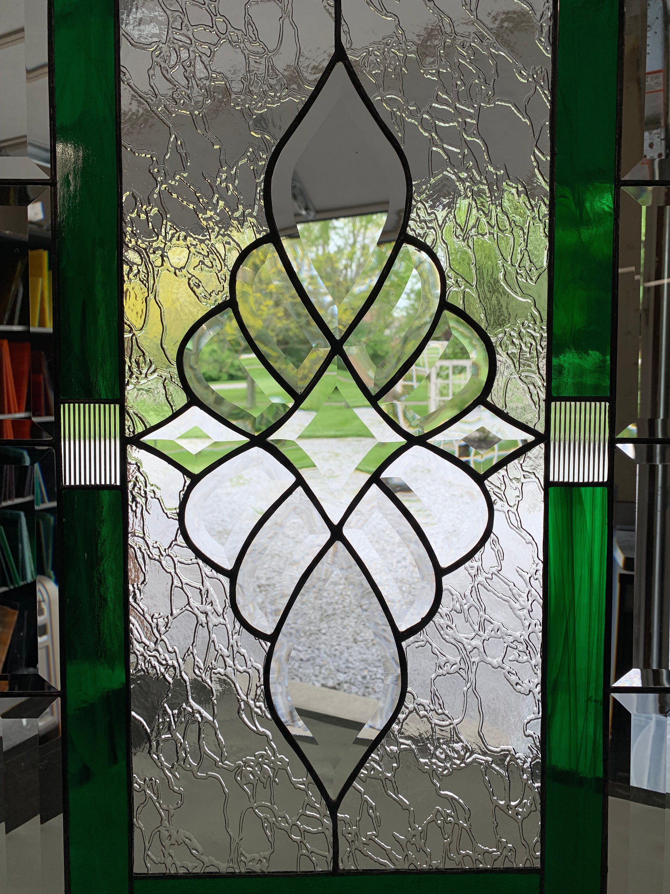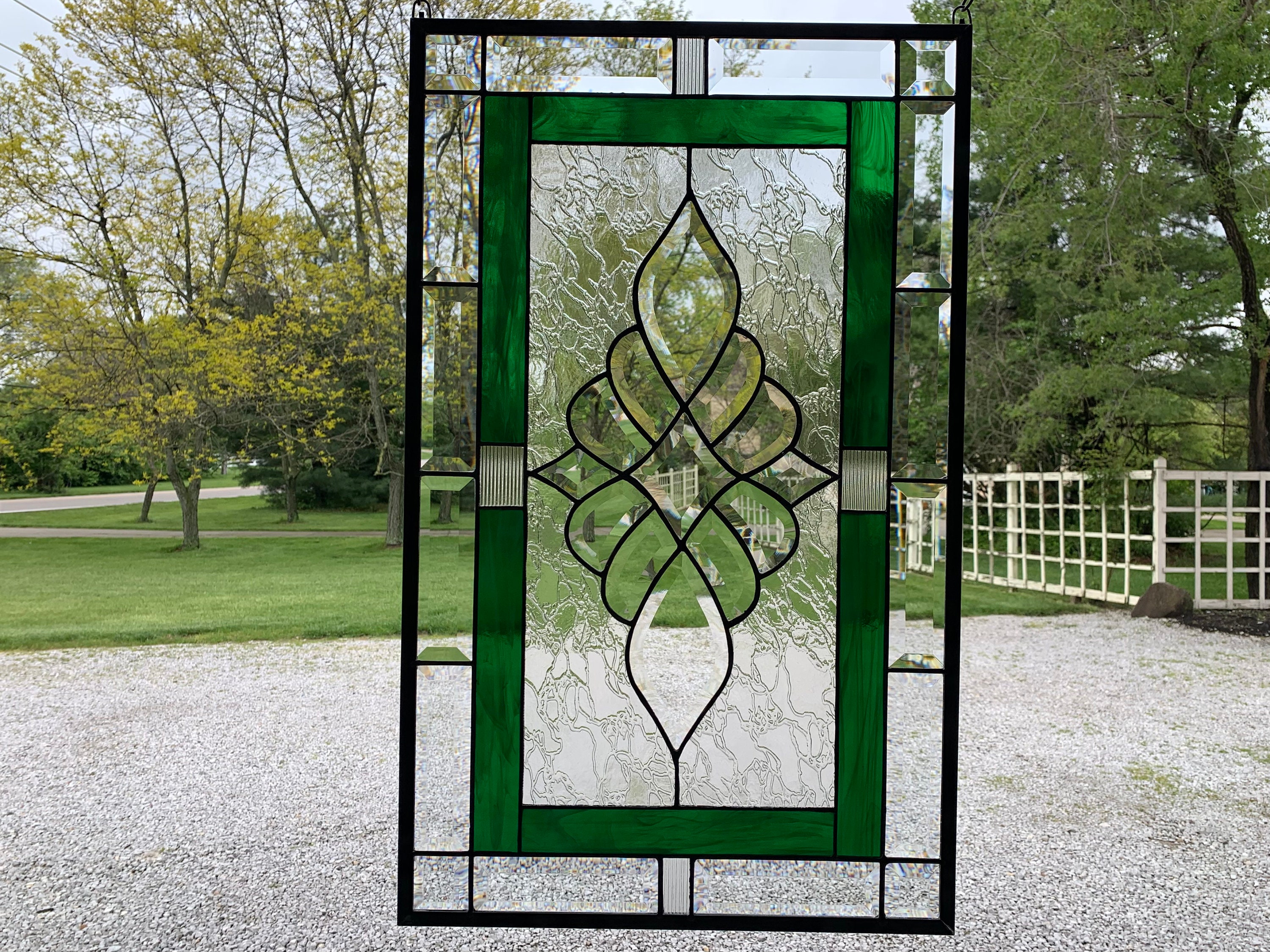 This beautiful stained glass window is made with 16 rectangle bevels and a elegant center bevel cluster. Clear delta glass is framed with a dark emerald green wispy glass and clear accents. The beveled cluster used in the center is designed to catch and reflect the light creating a wonderful visual effect. The bevels throughout the panel act as prisms that refract the light splitting into the colors of the rainbow.