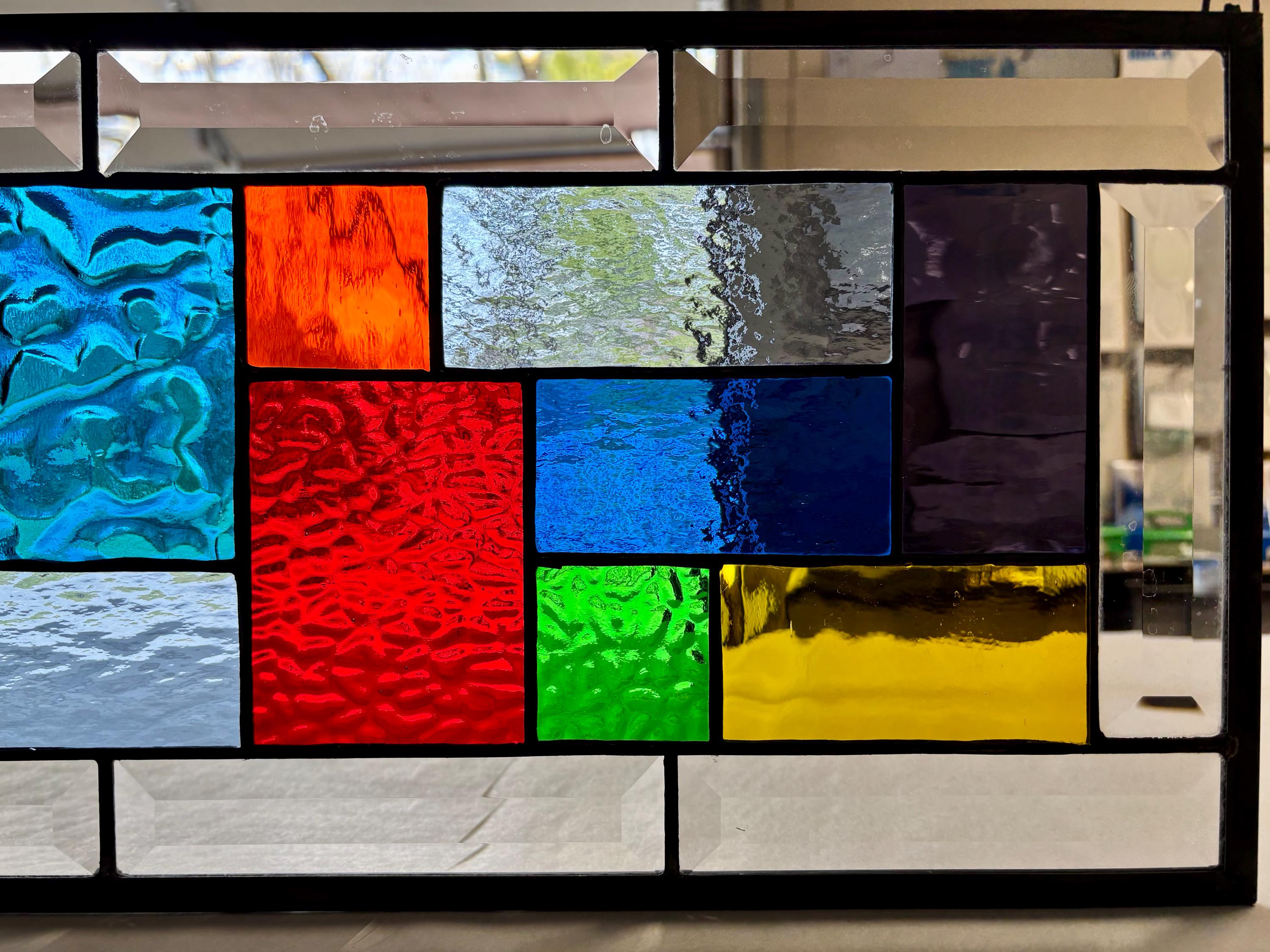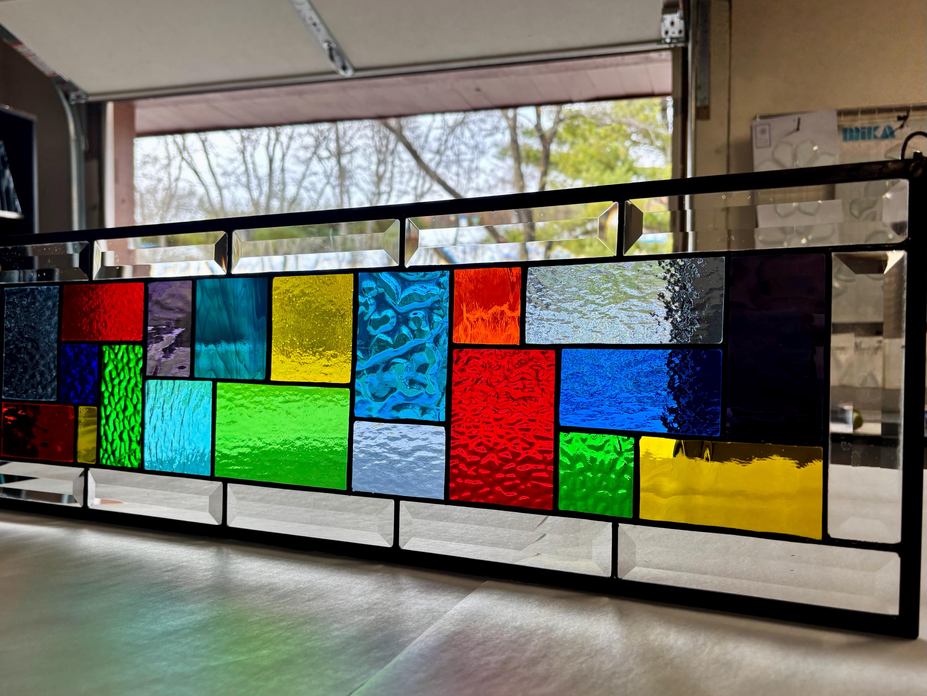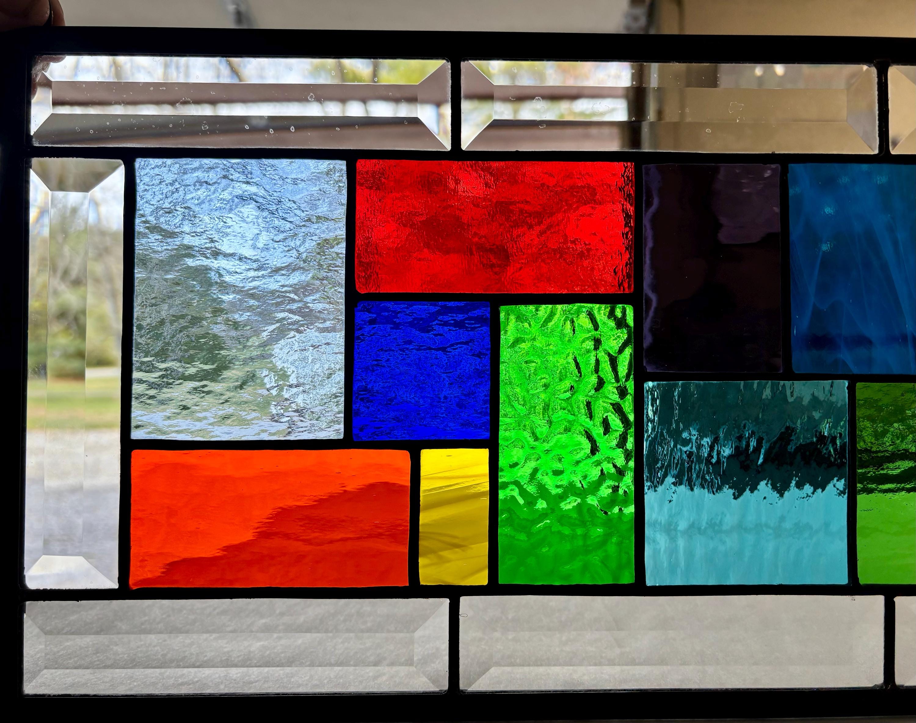 This vibrant panel features an assortment of rich jewel-tone art glass in a modern geometric layout, framed with brilliant beveled glass that catches and refracts the light. Each piece is hand-cut, foiled, and soldered using the Tiffany method for a crisp, polished finish. This panel is in stock and ready to ship.