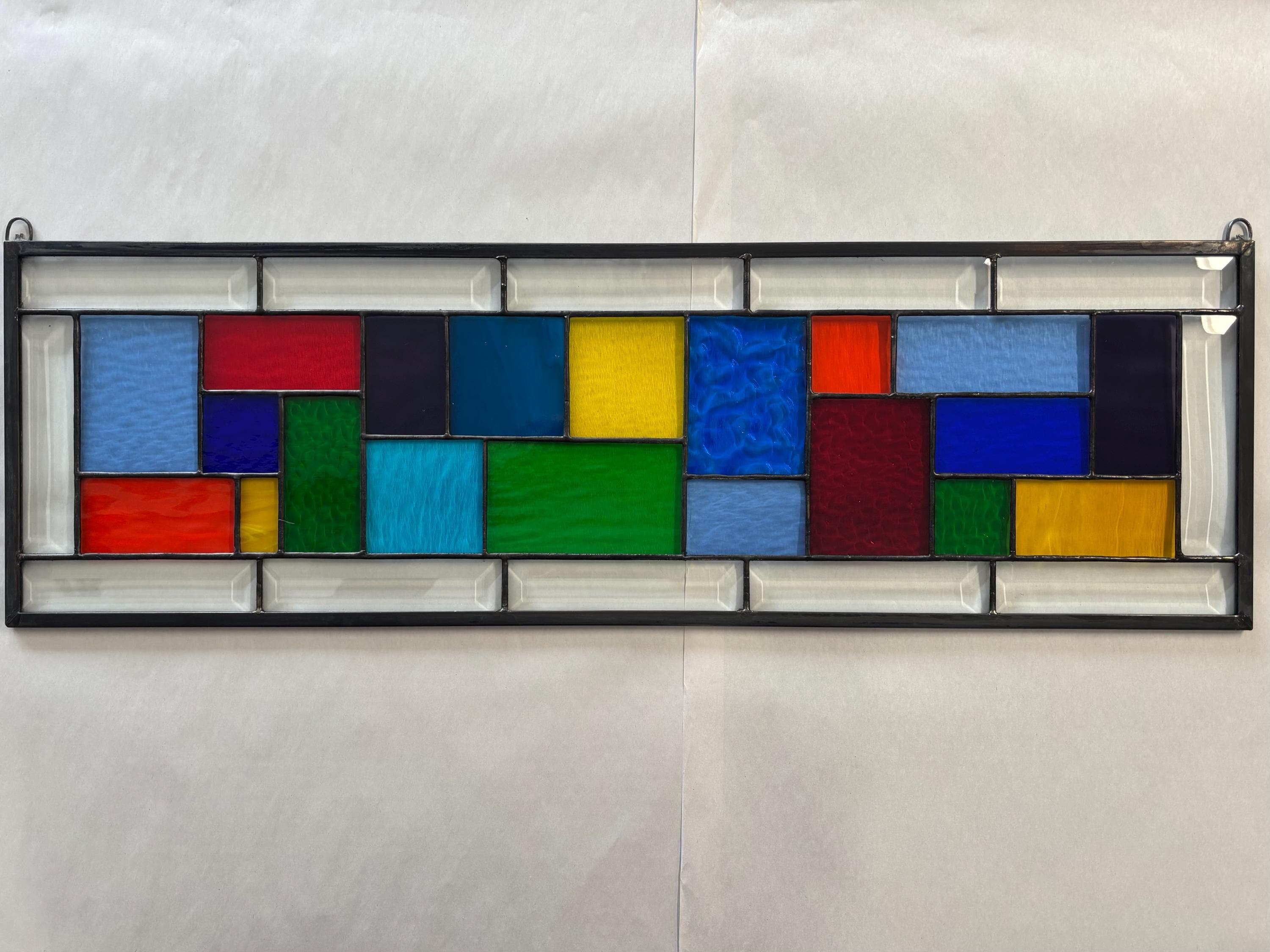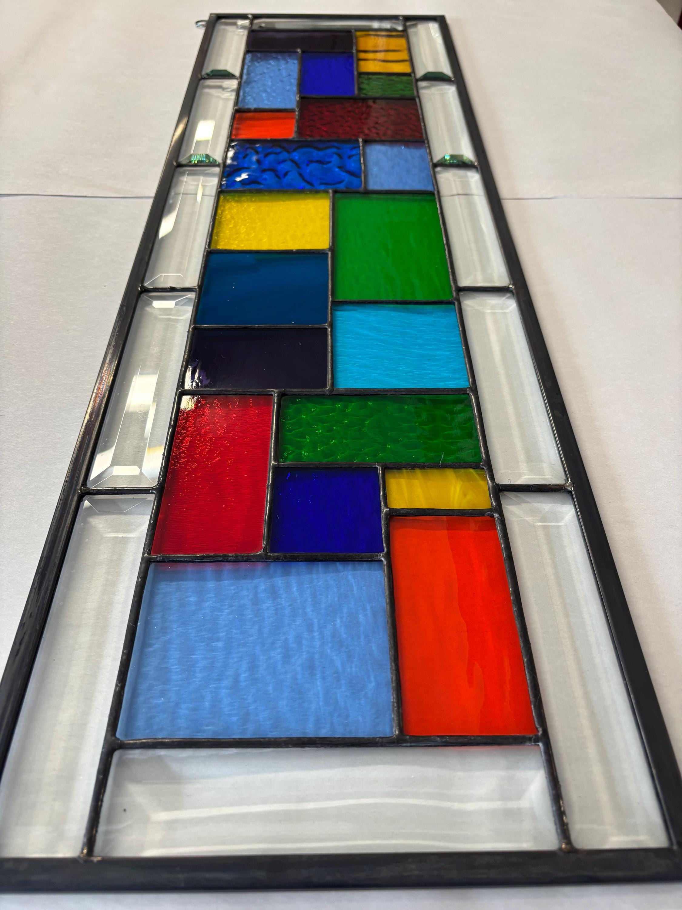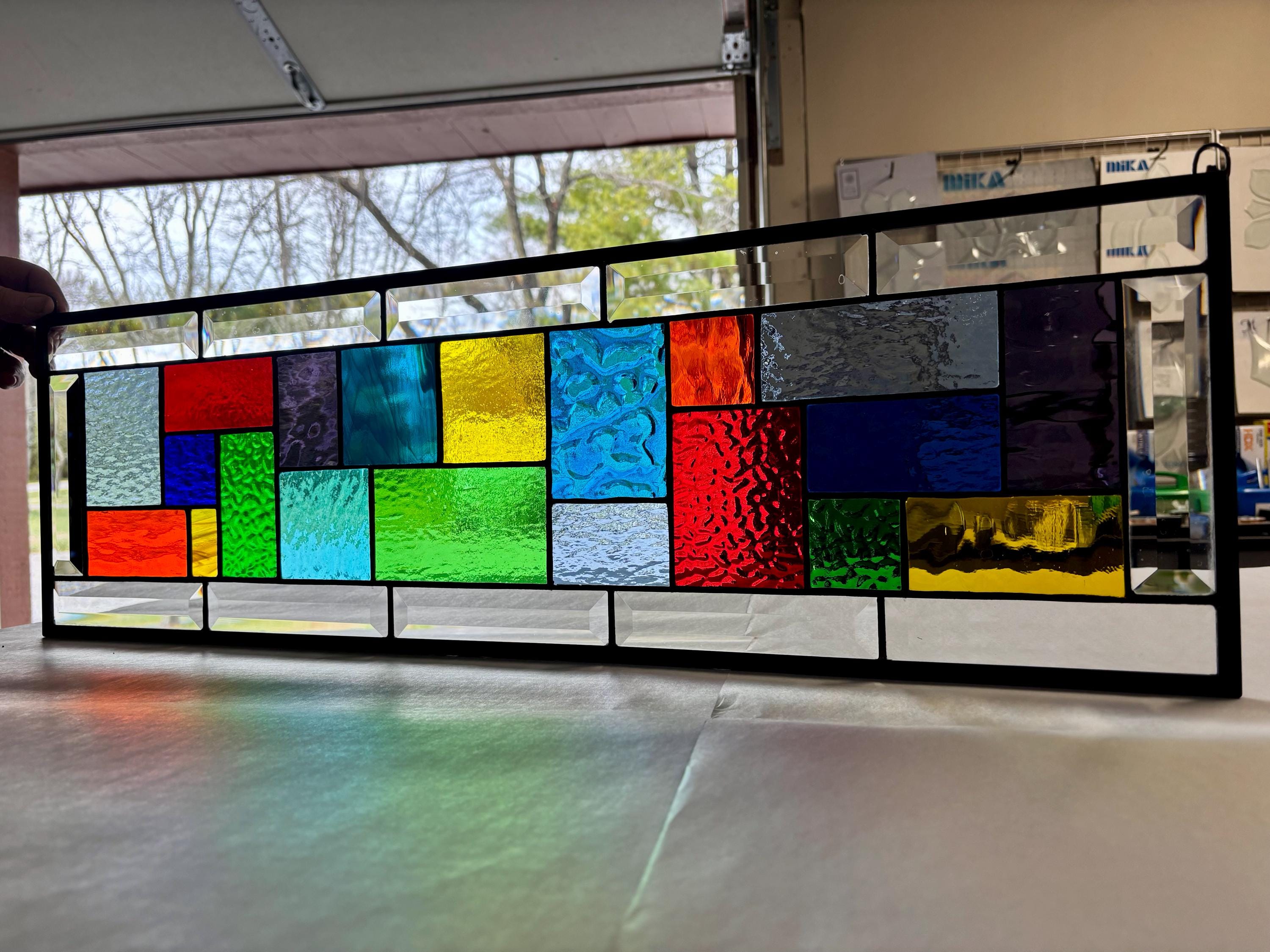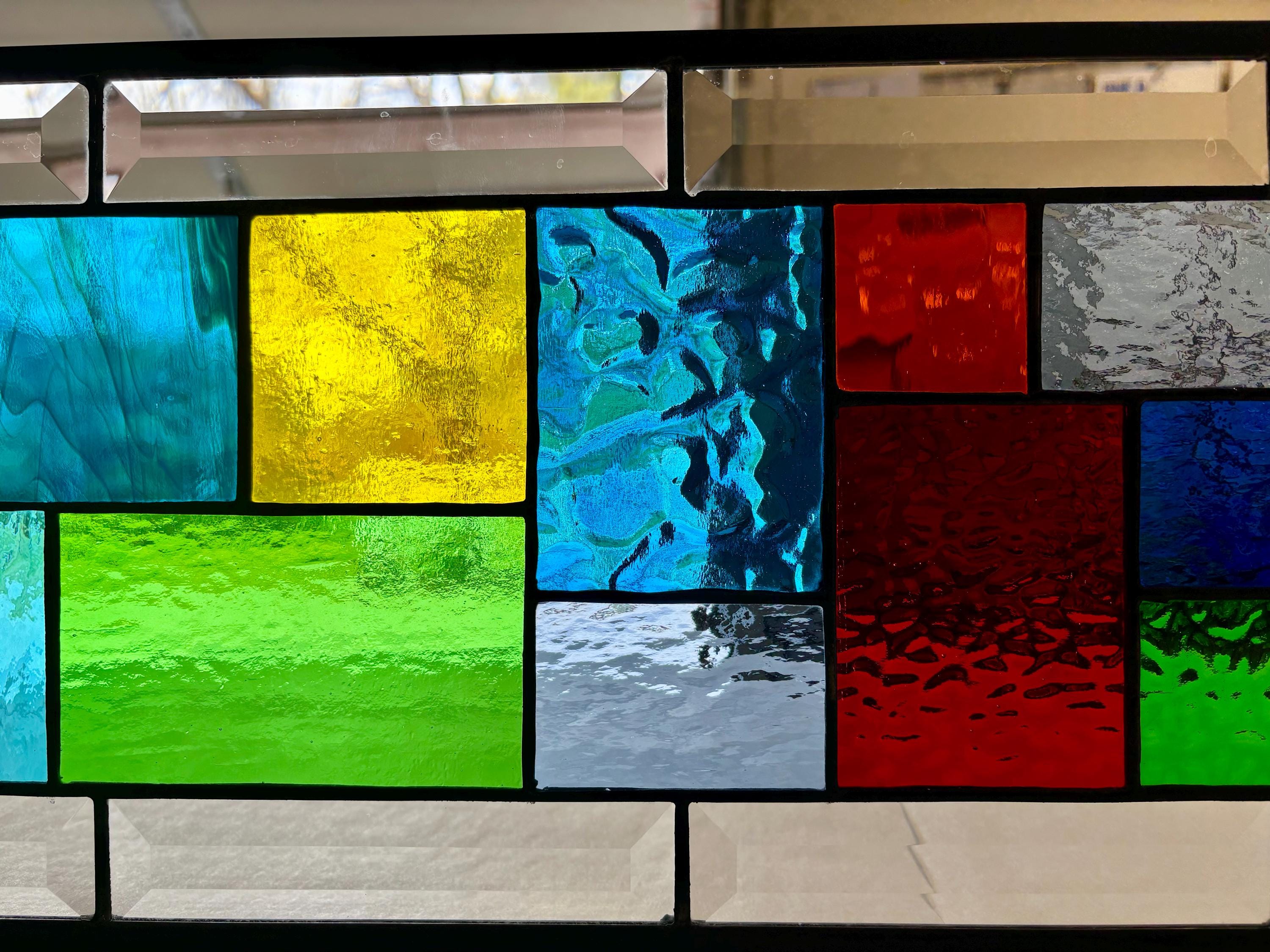 This vibrant panel features an assortment of rich jewel-tone art glass in a modern geometric layout, framed with brilliant beveled glass that catches and refracts the light. Each piece is hand-cut, foiled, and soldered using the Tiffany method for a crisp, polished finish. This panel is in stock and ready to ship.