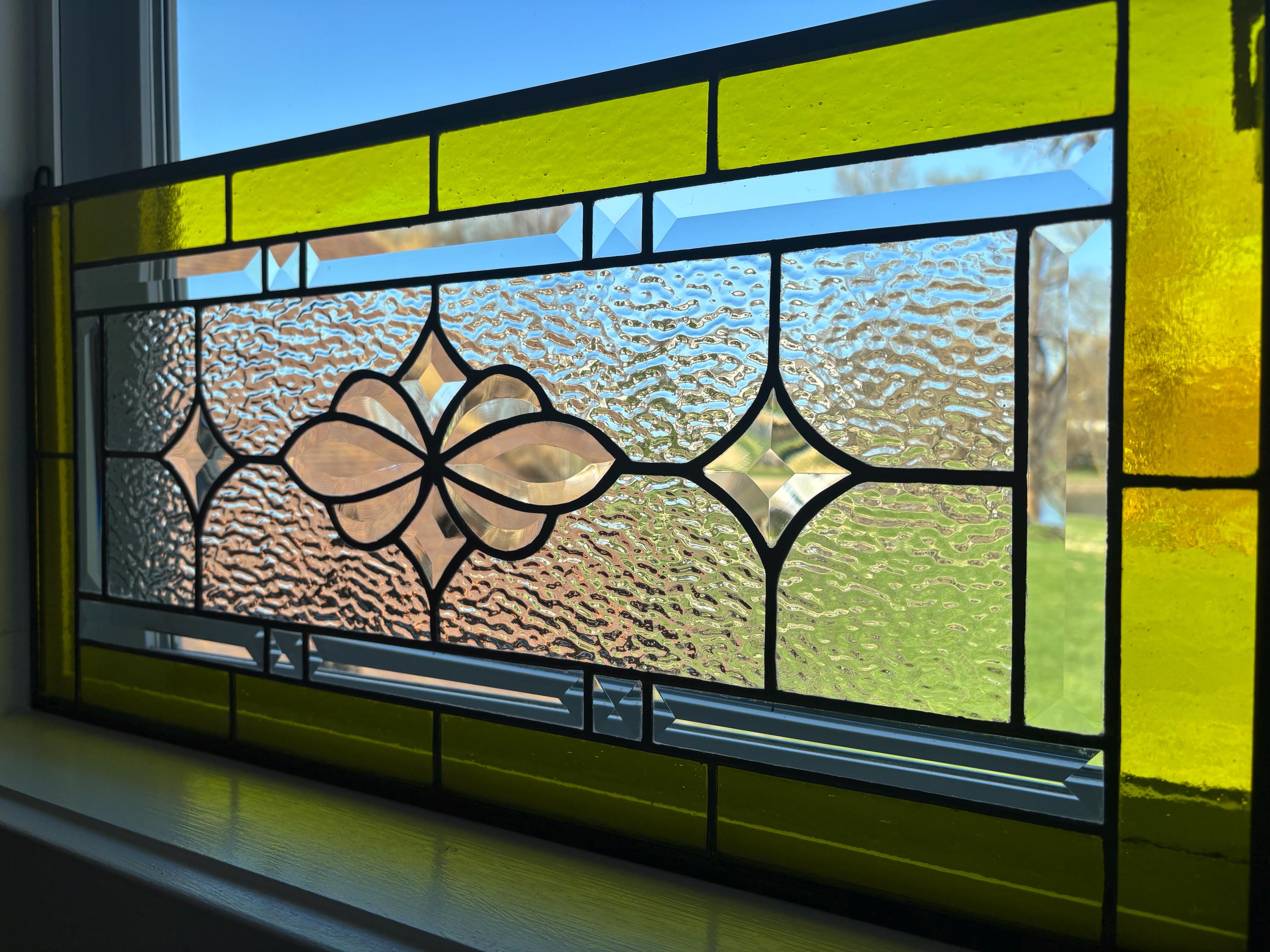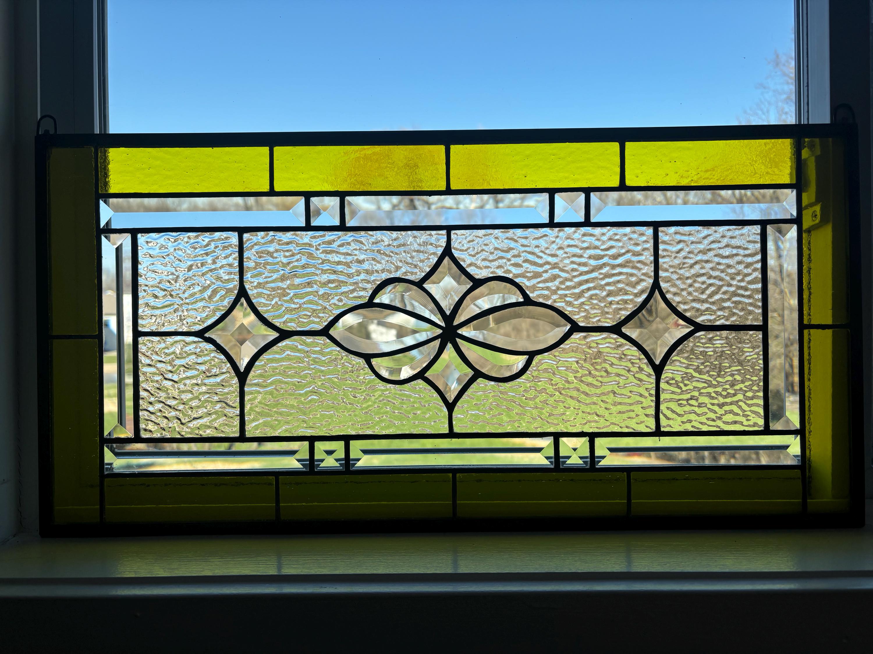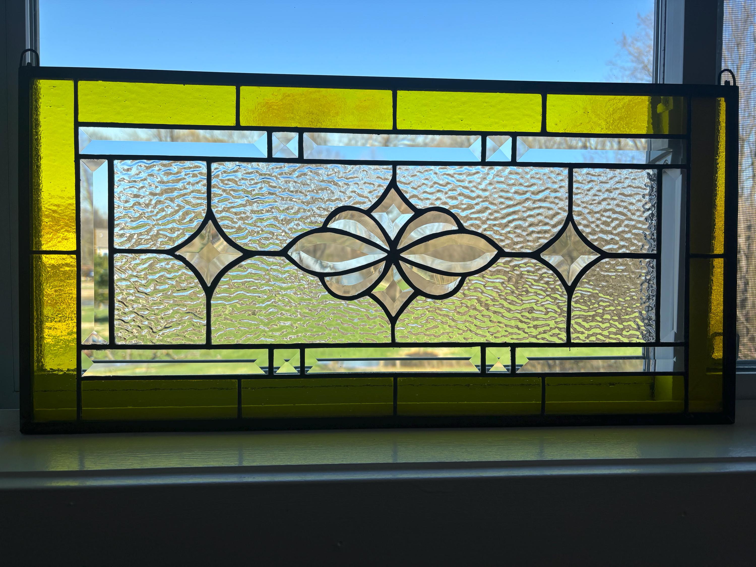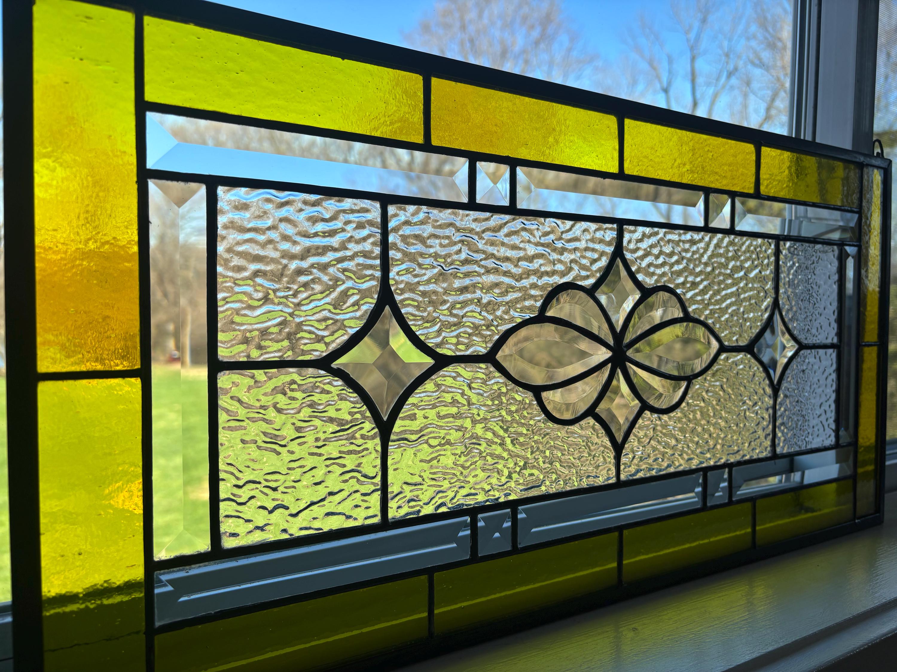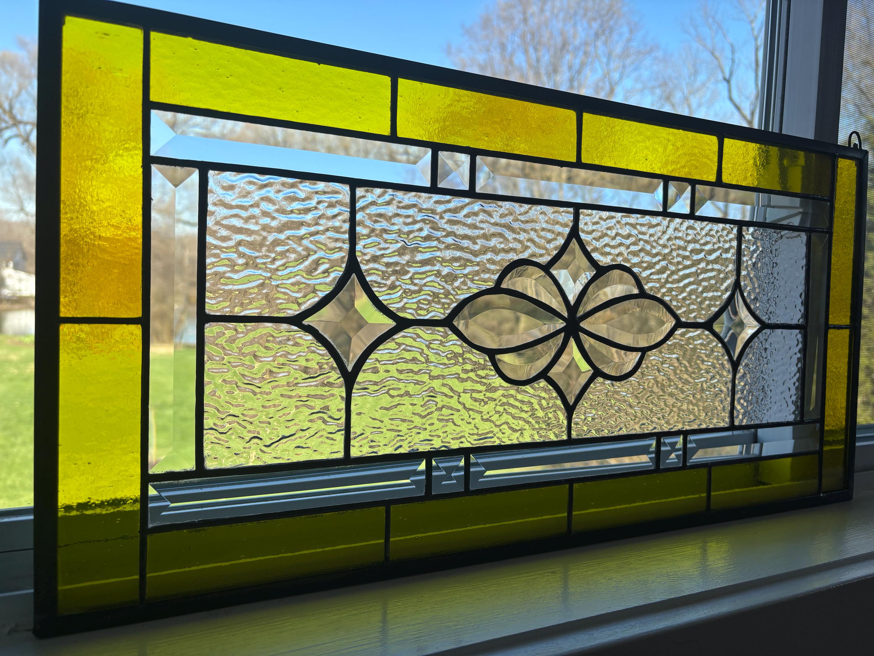Handmade stained glass panel in Lemon Yellow and clear ripple with bevel accents; 11.5" x 23.5" handcrafted by Honey Dew Glass.