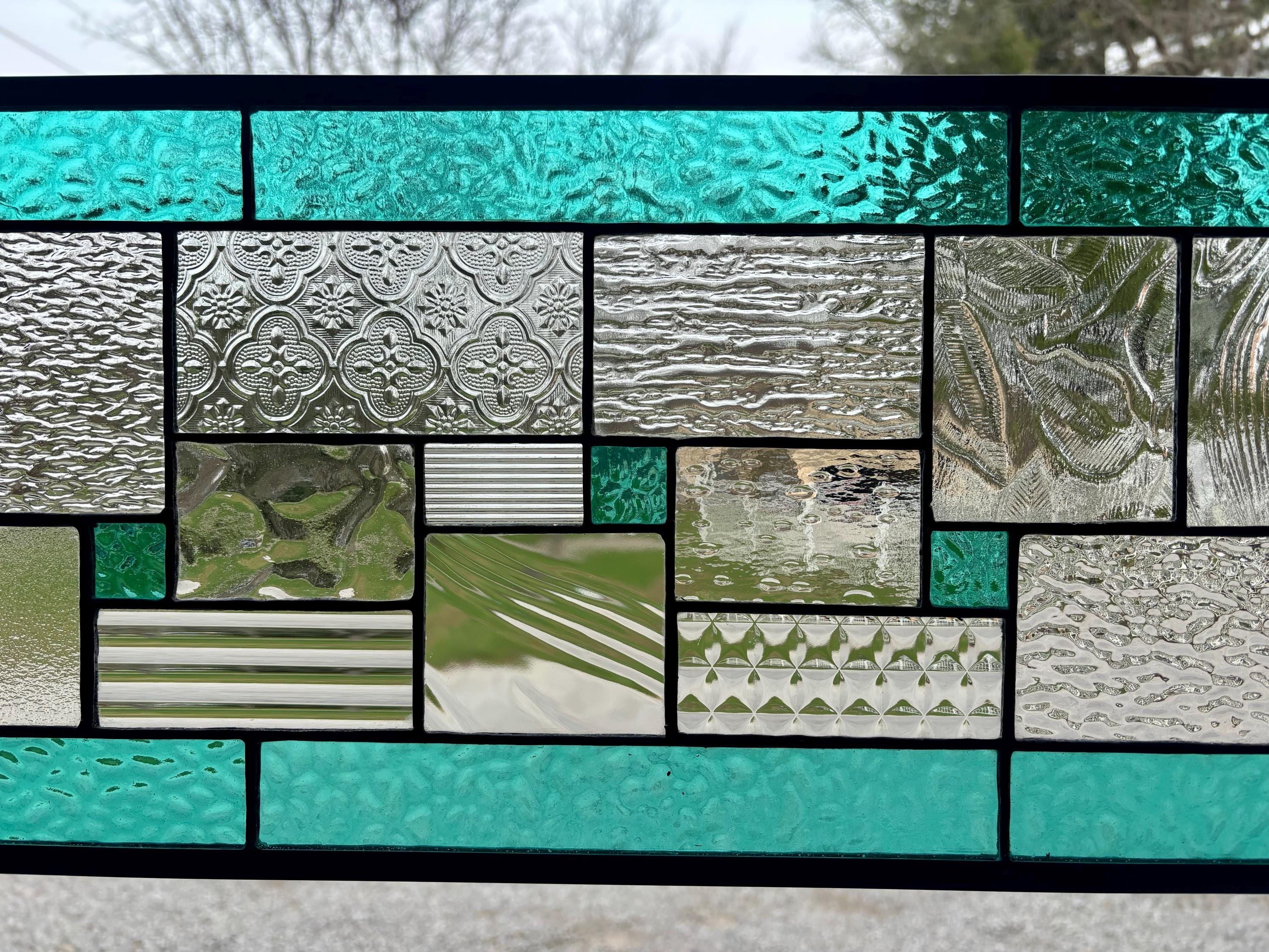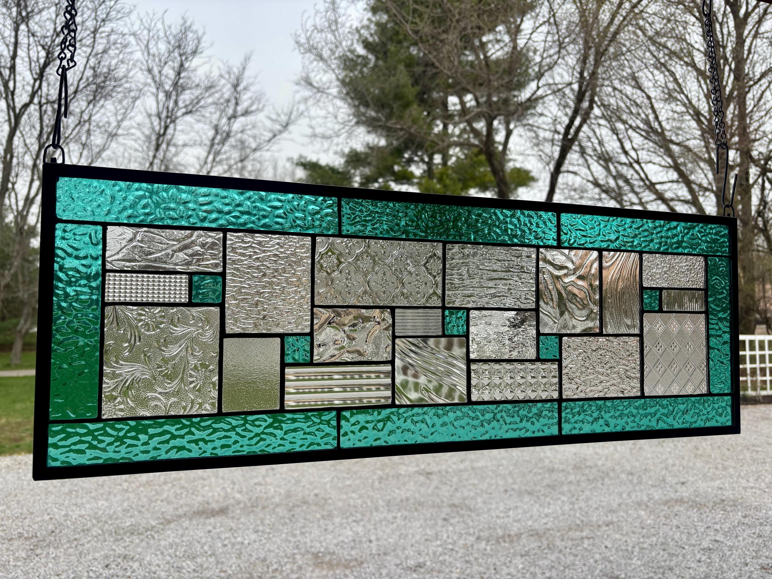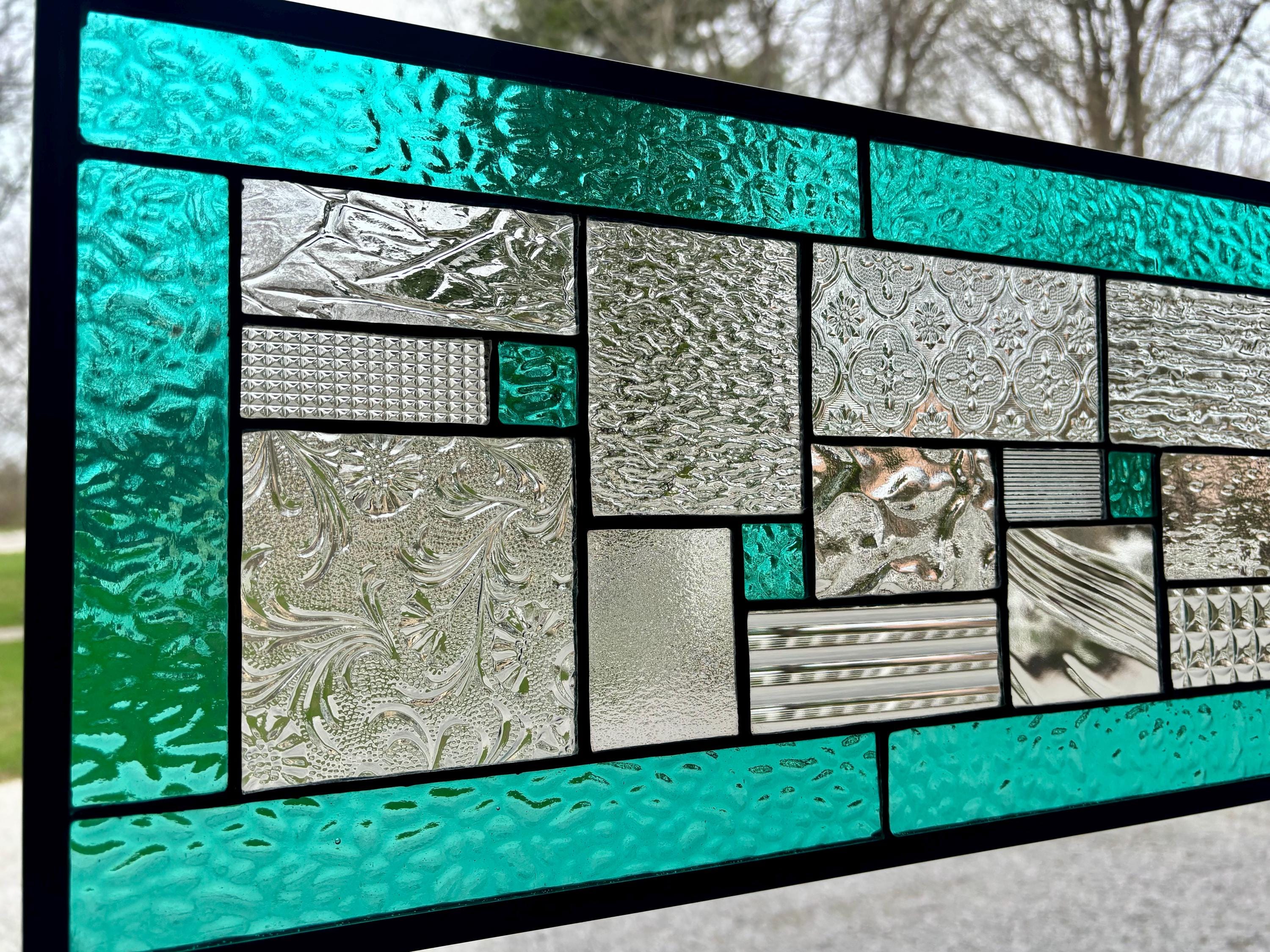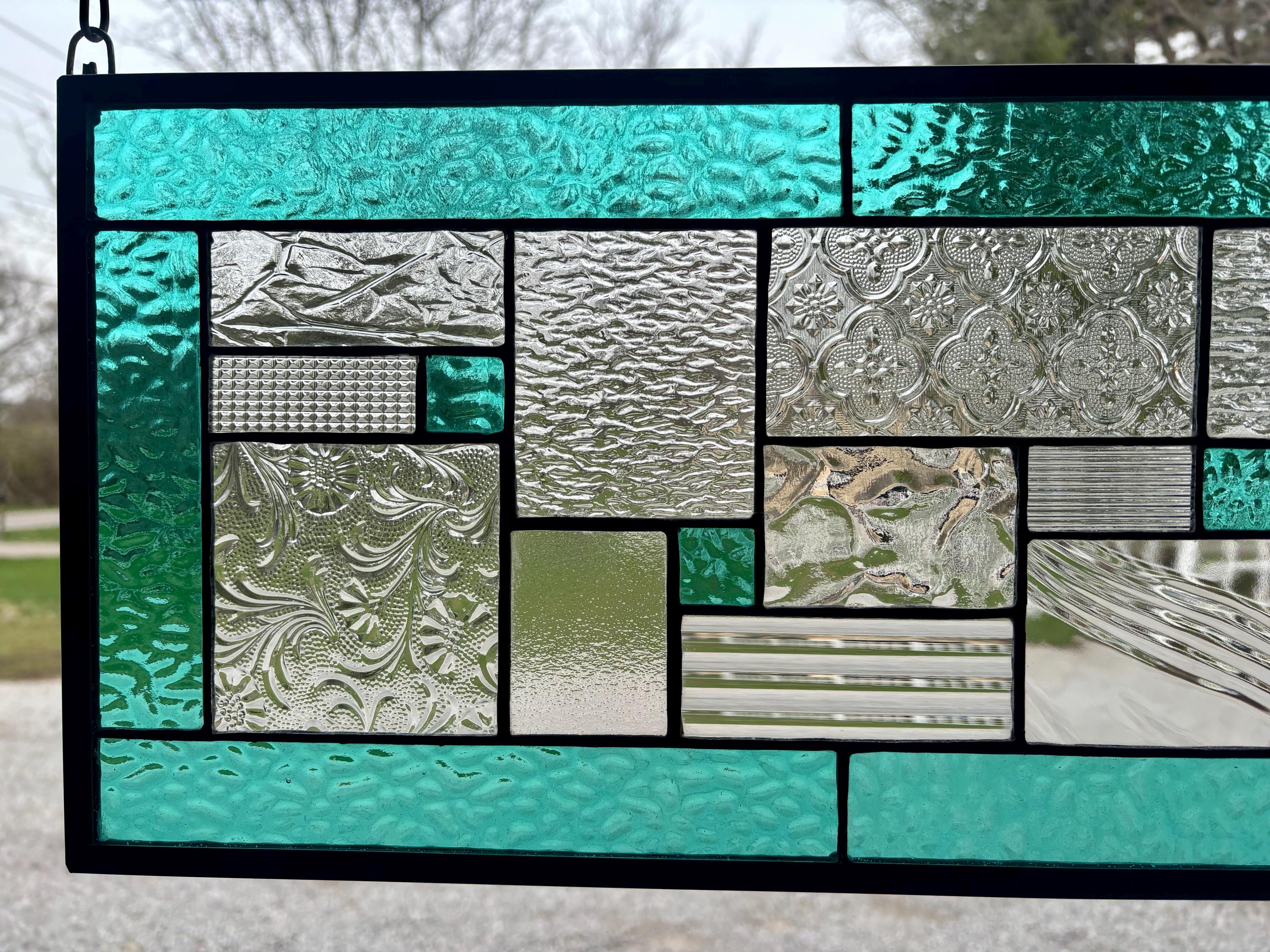 Geometric stained glass panel with aqua mist English Muffle glass and assorted clear textures, handcrafted in Ohio by Honey Dew Glass.