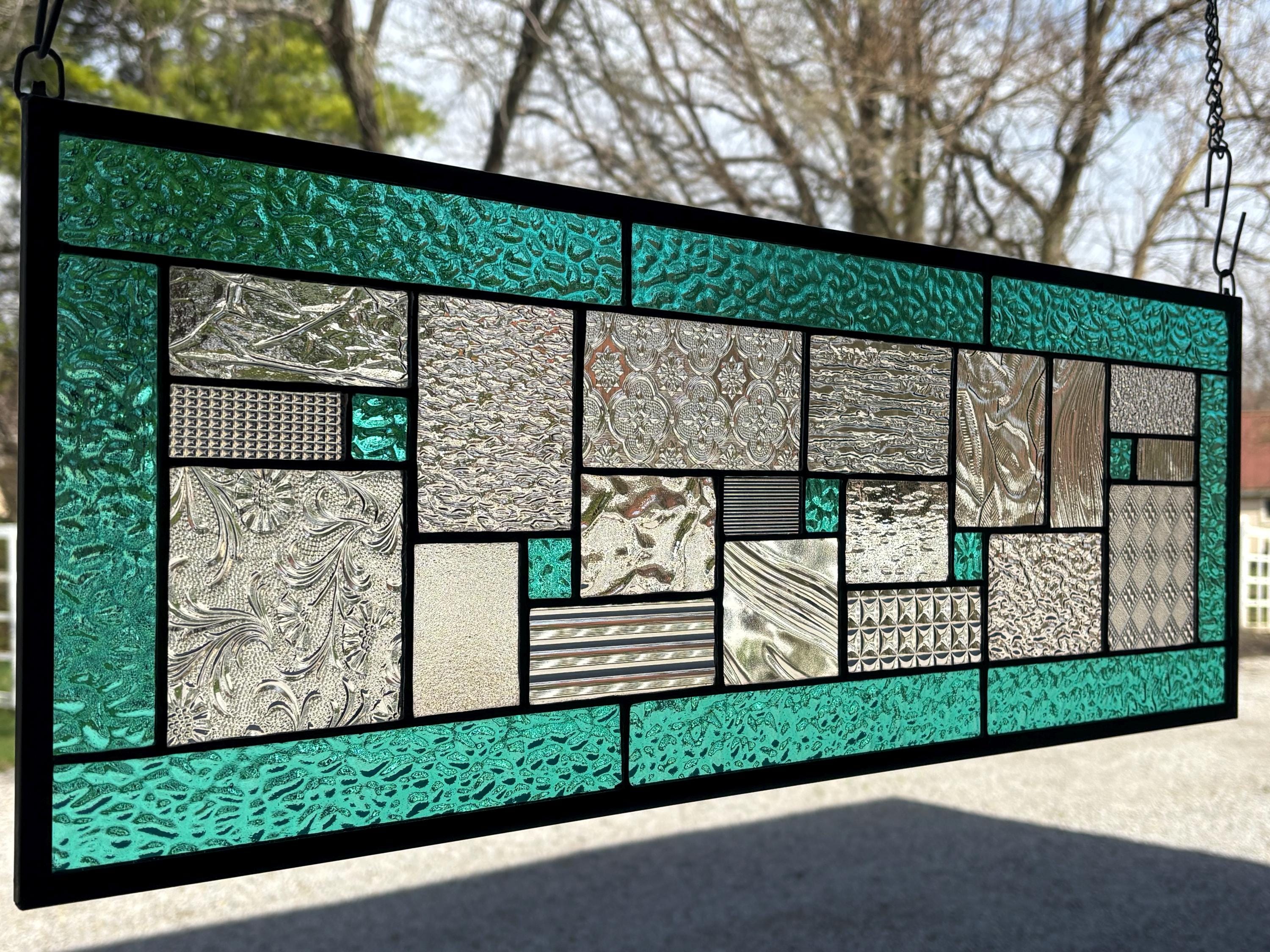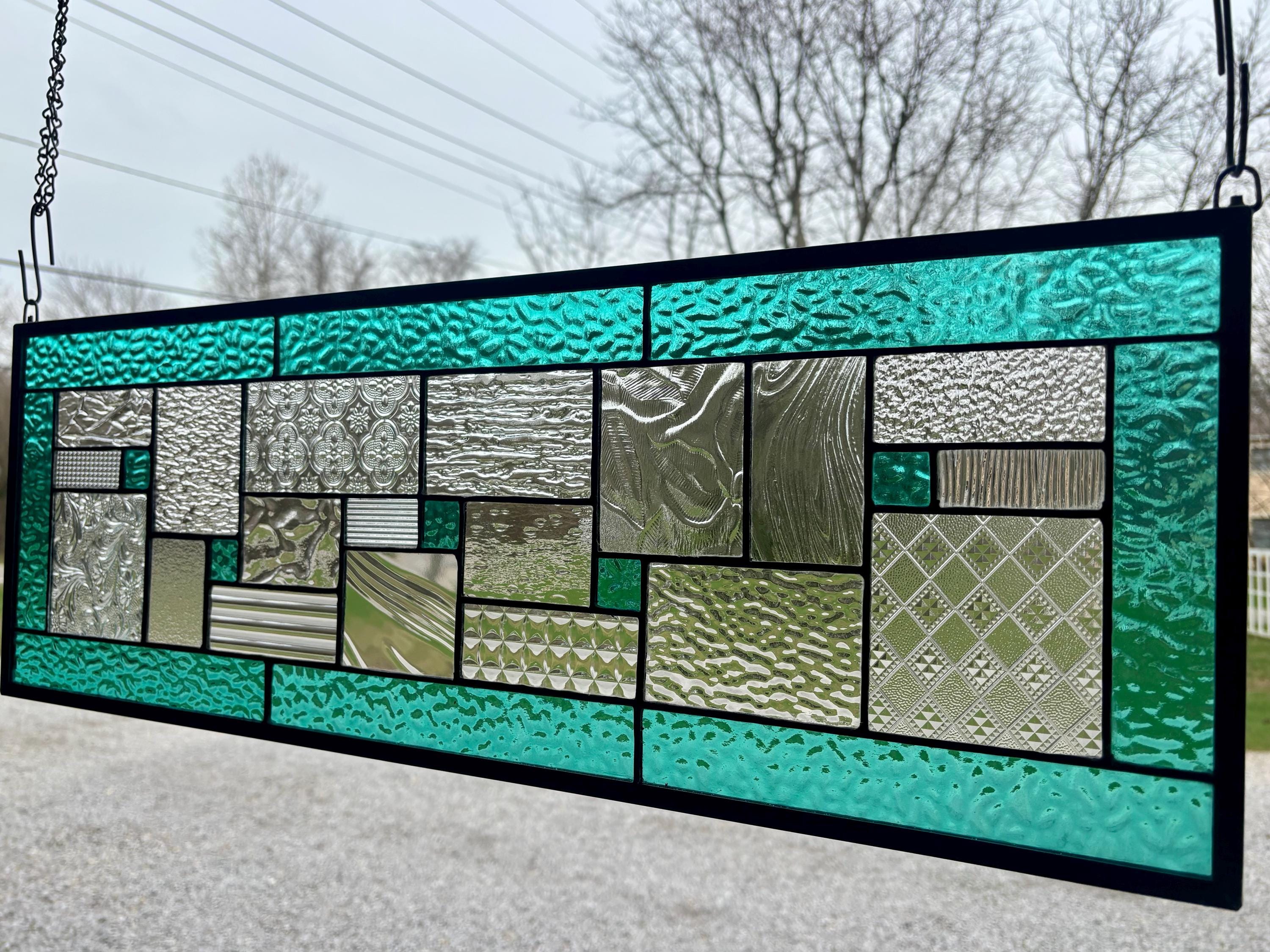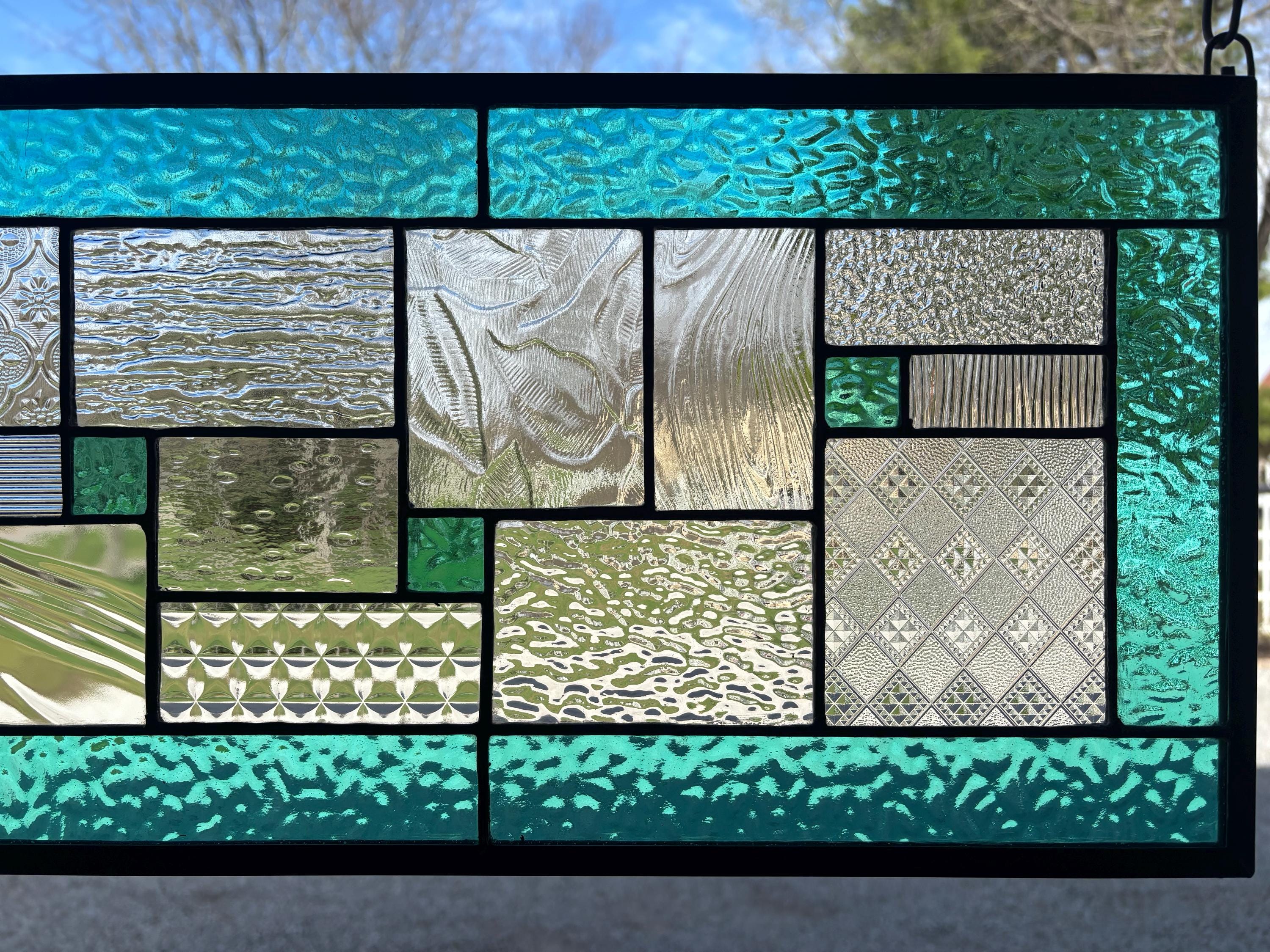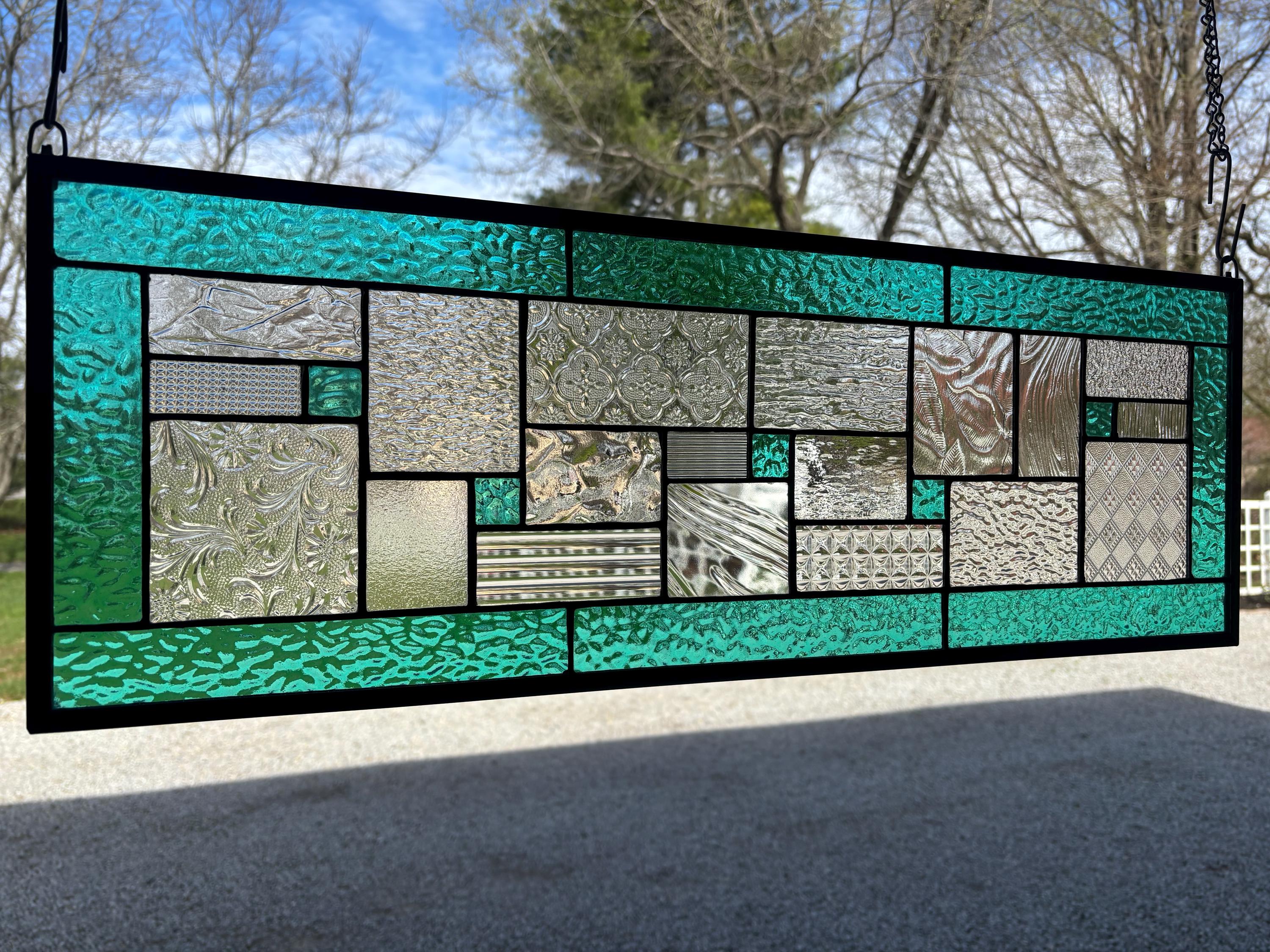 Geometric stained glass panel with aqua mist English Muffle glass and assorted clear textures, handcrafted in Ohio by Honey Dew Glass.