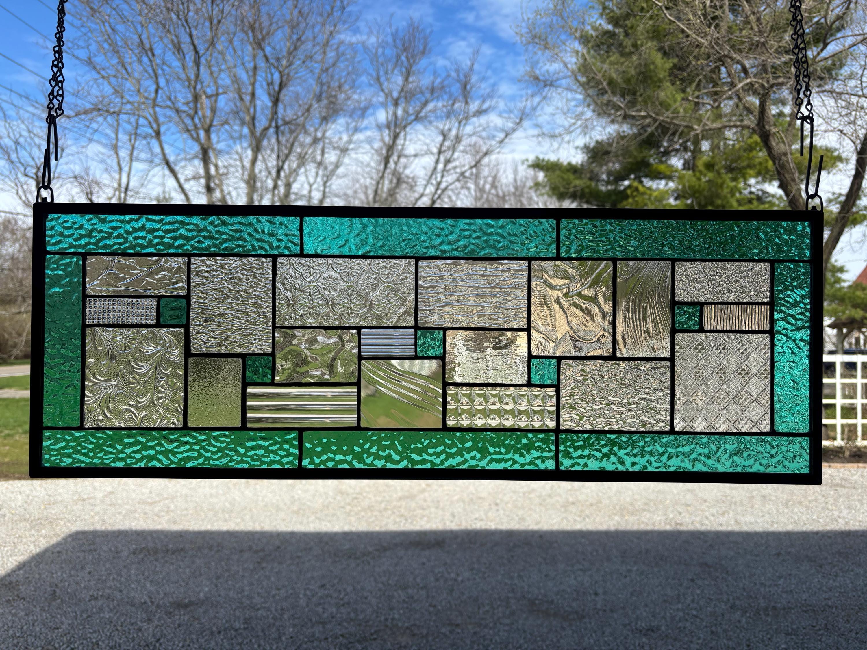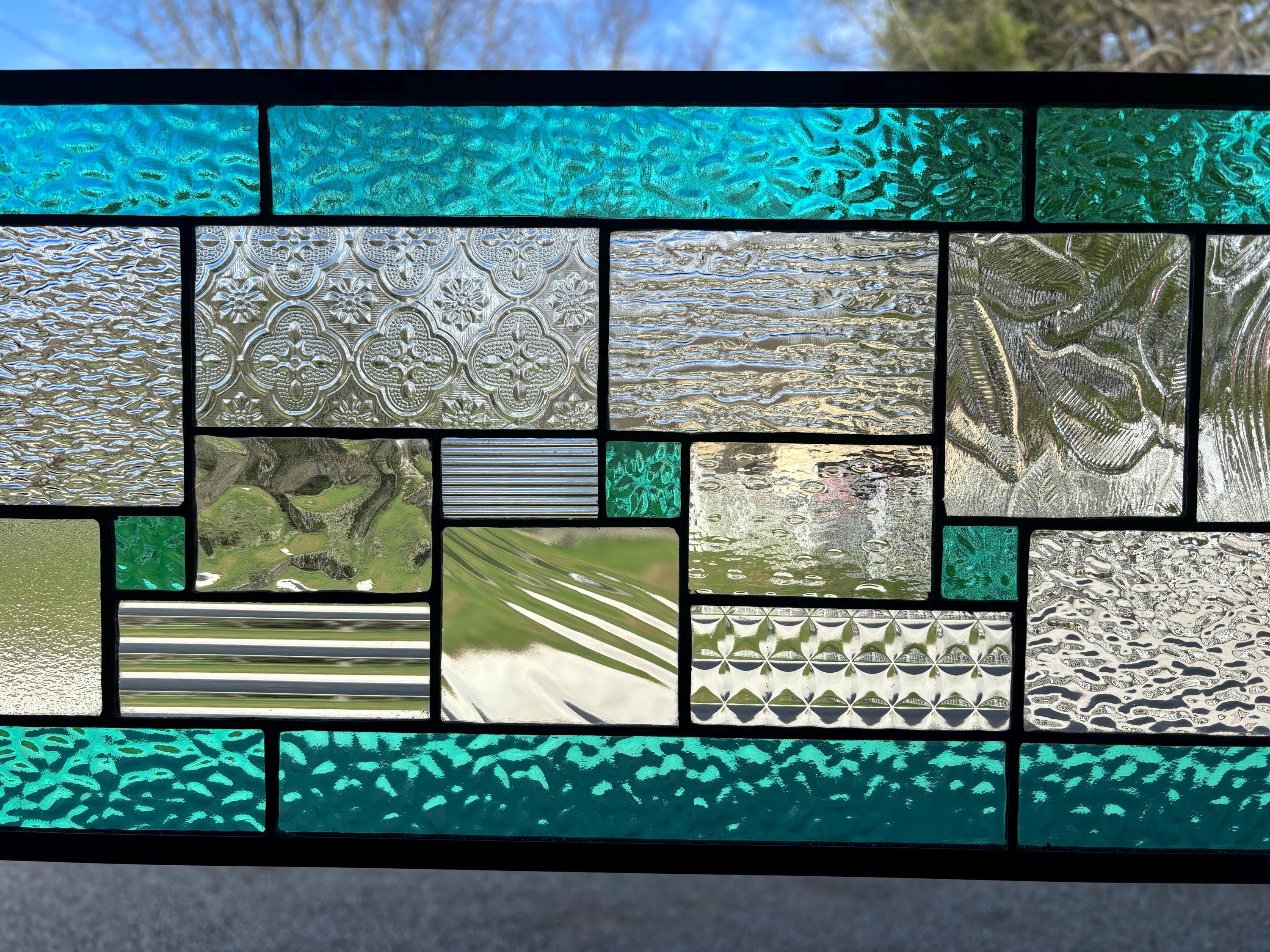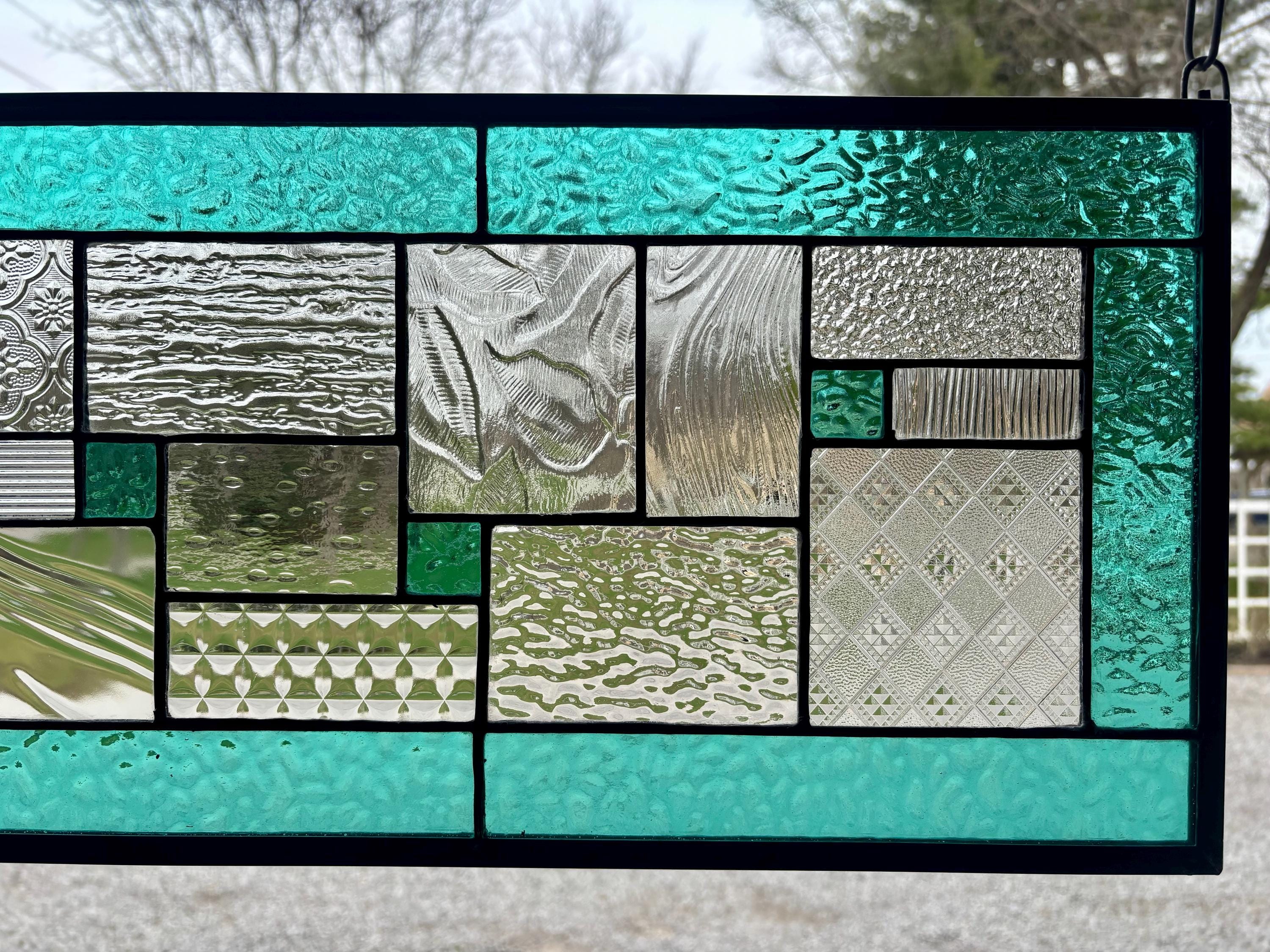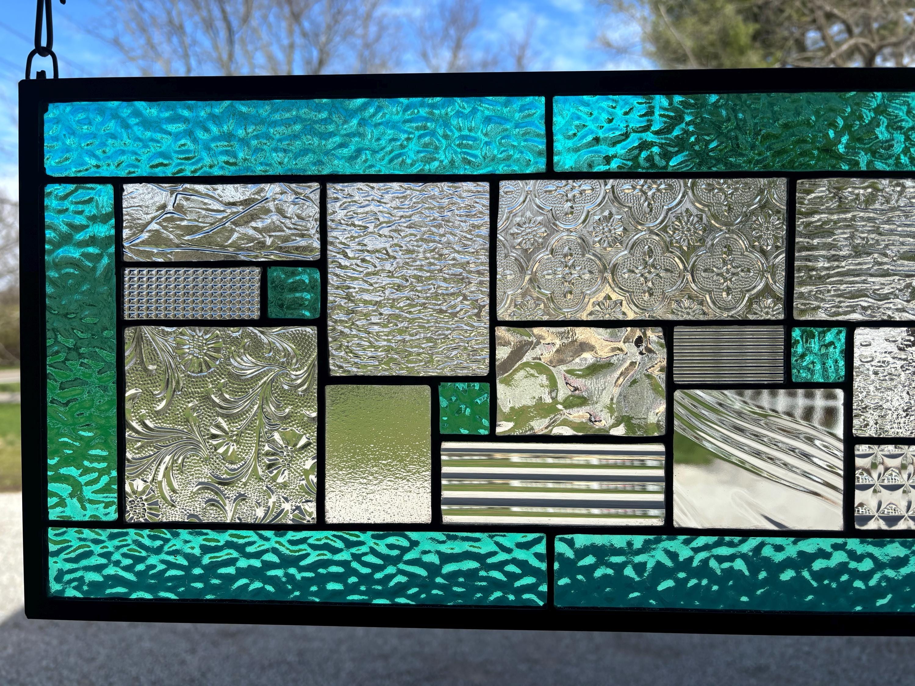 Geometric stained glass panel with aqua mist English Muffle glass and assorted clear textures, handcrafted in Ohio by Honey Dew Glass.