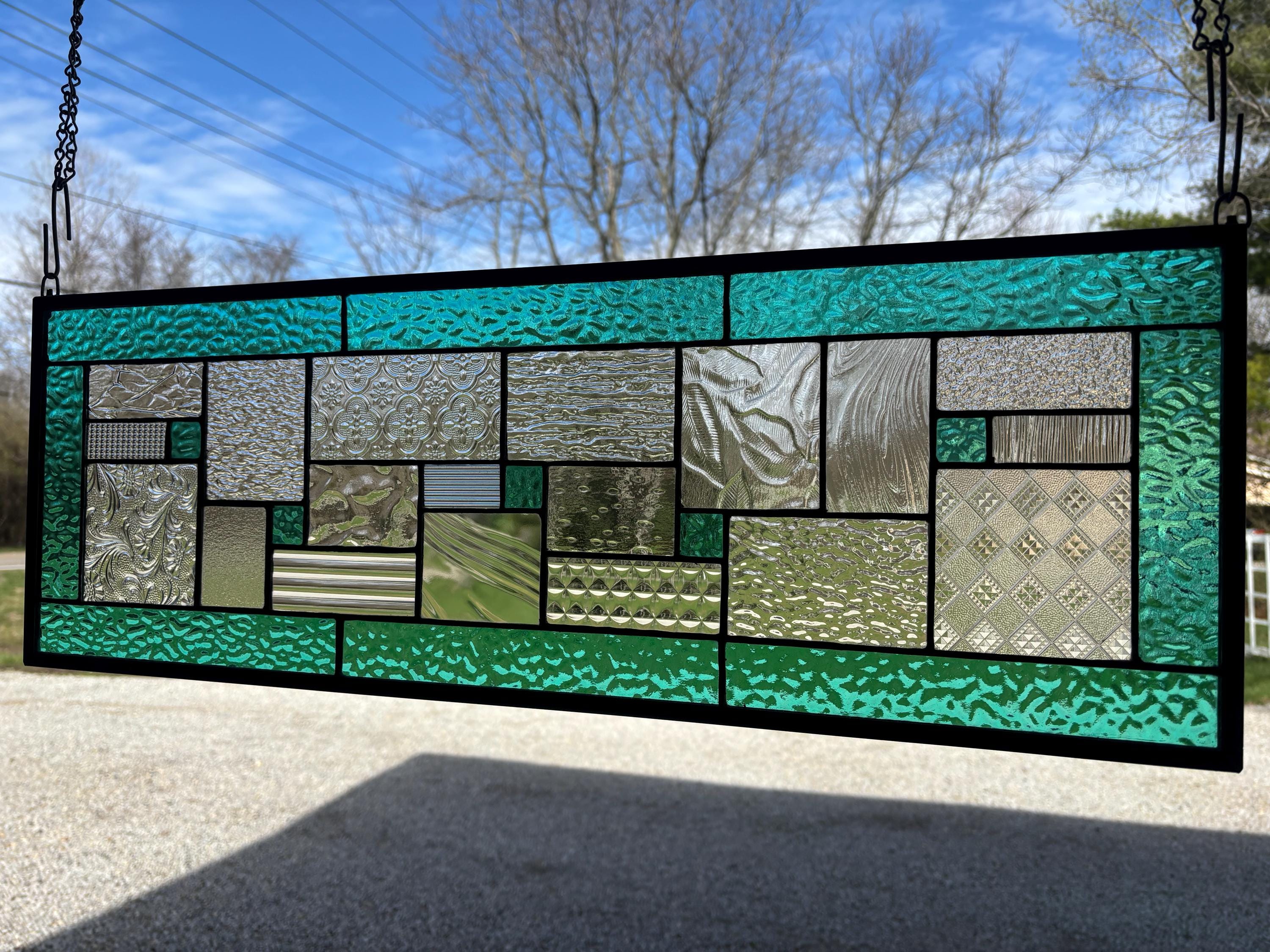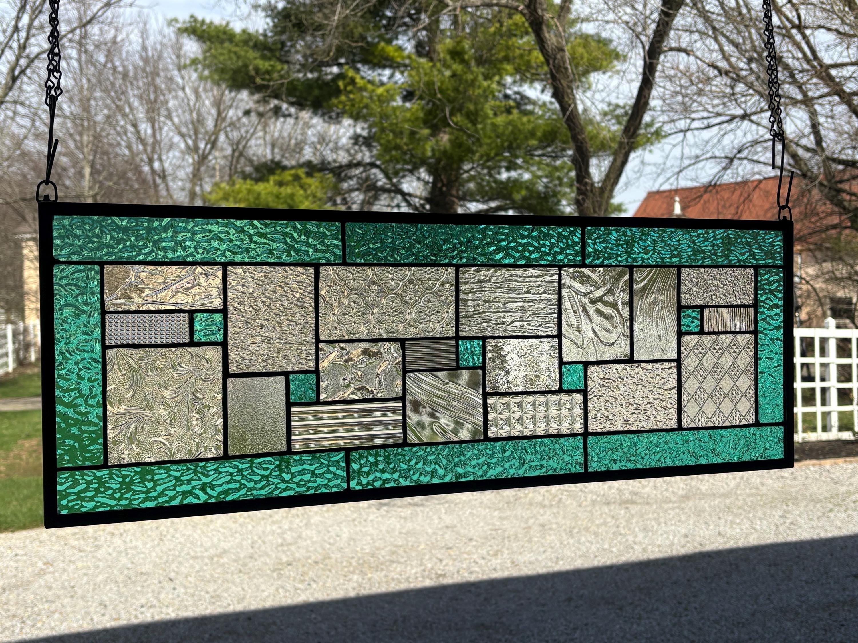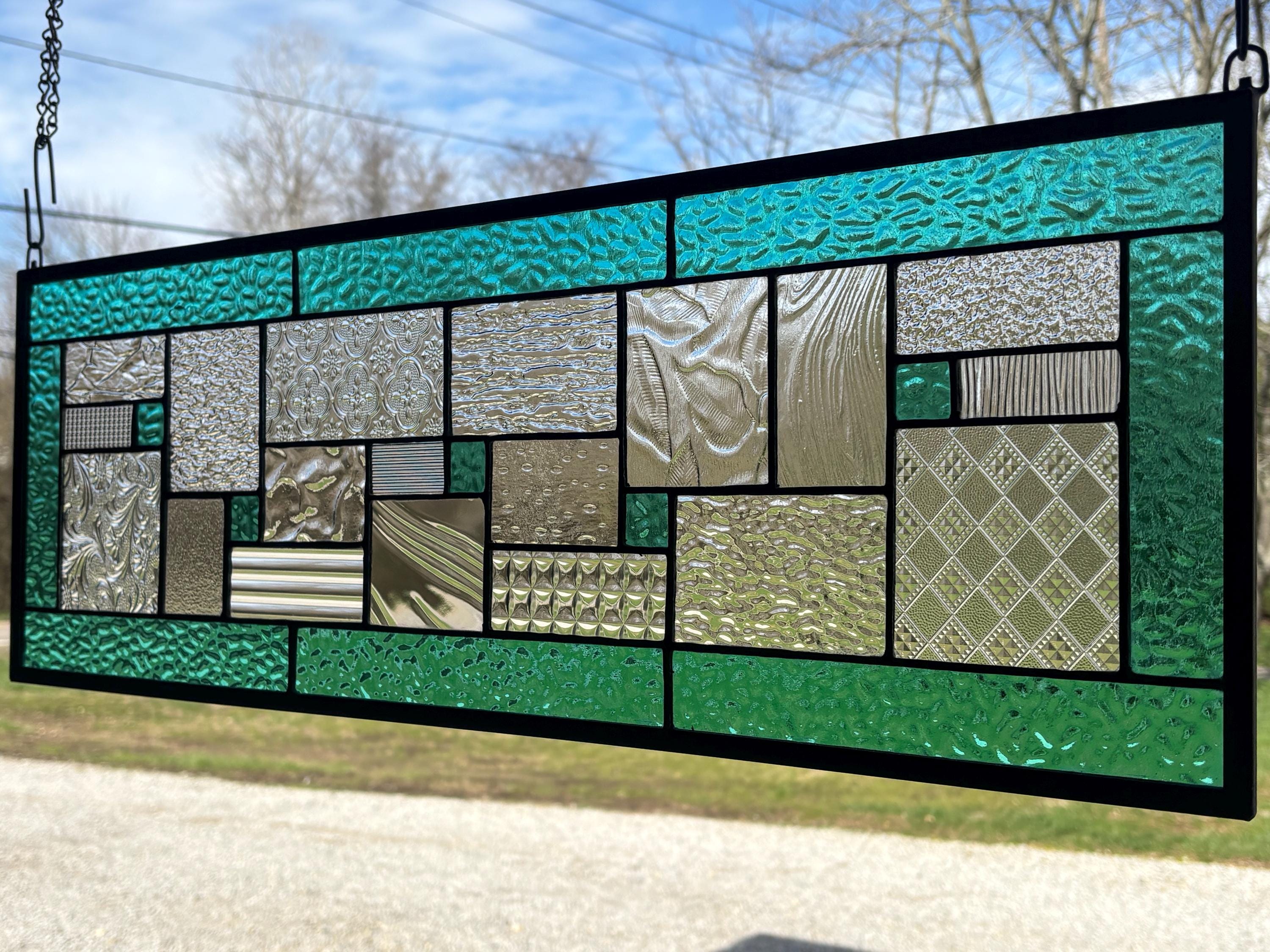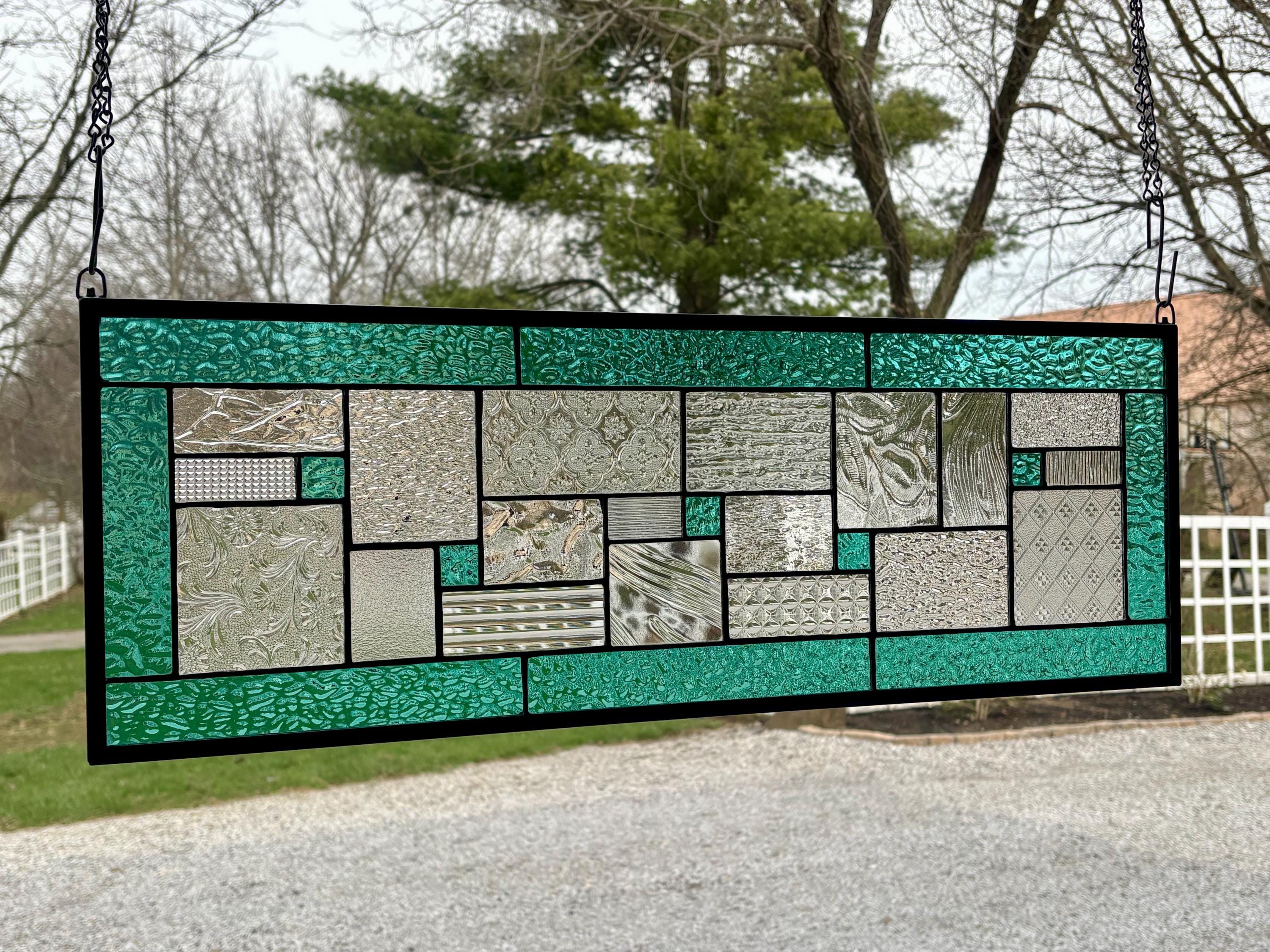 Geometric stained glass panel with aqua mist English Muffle glass and assorted clear textures, handcrafted in Ohio by Honey Dew Glass.