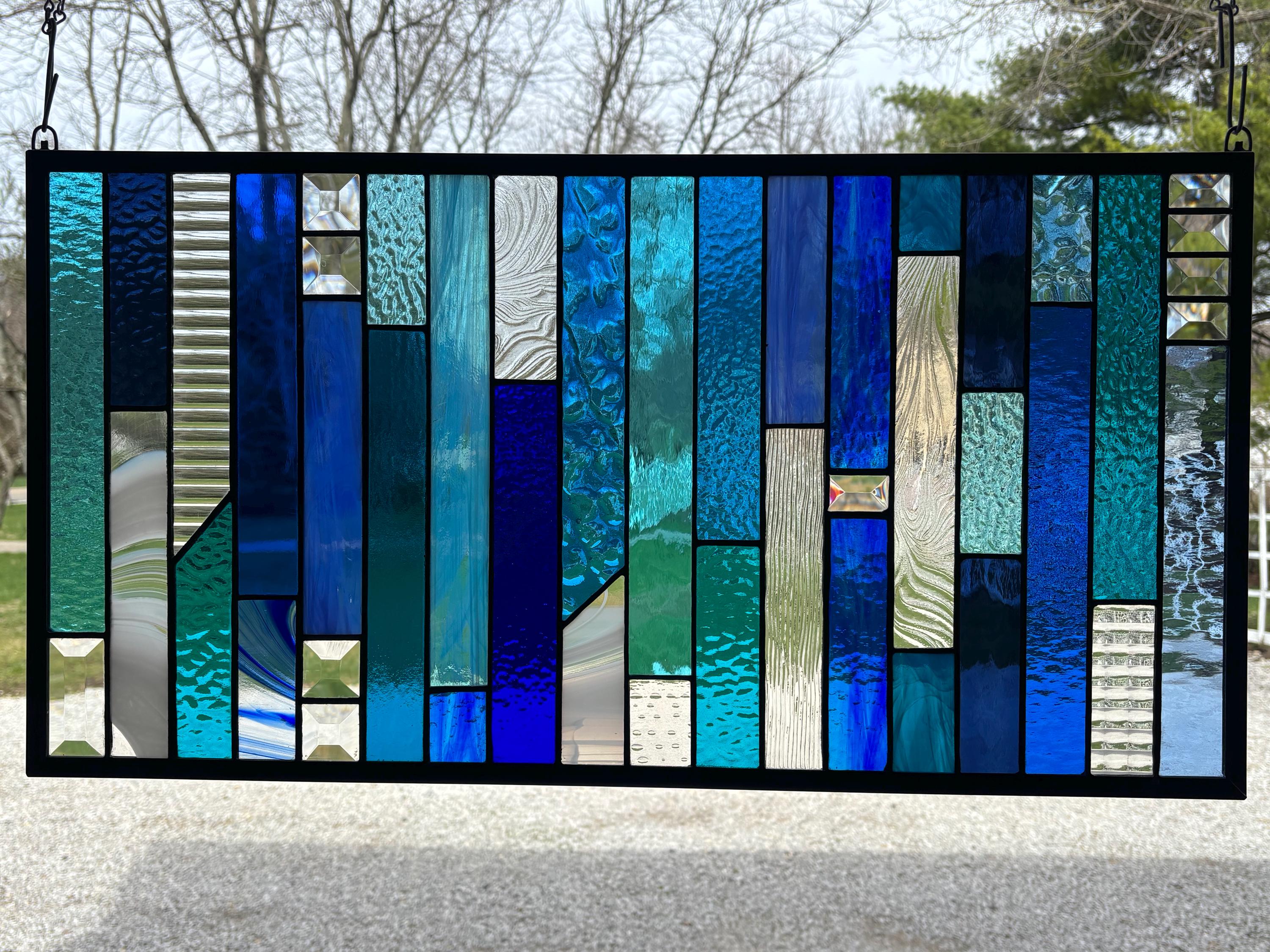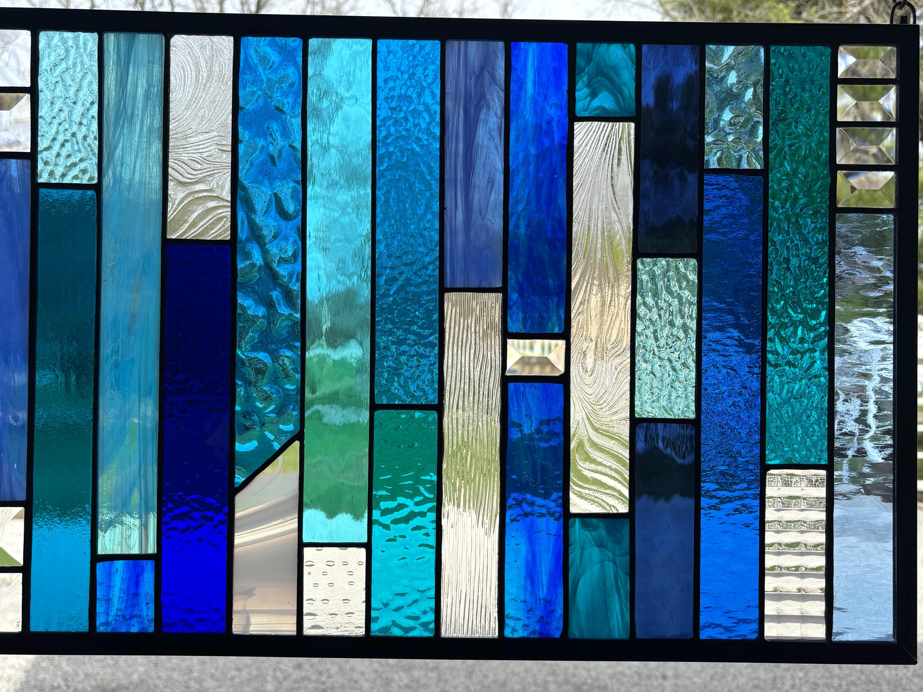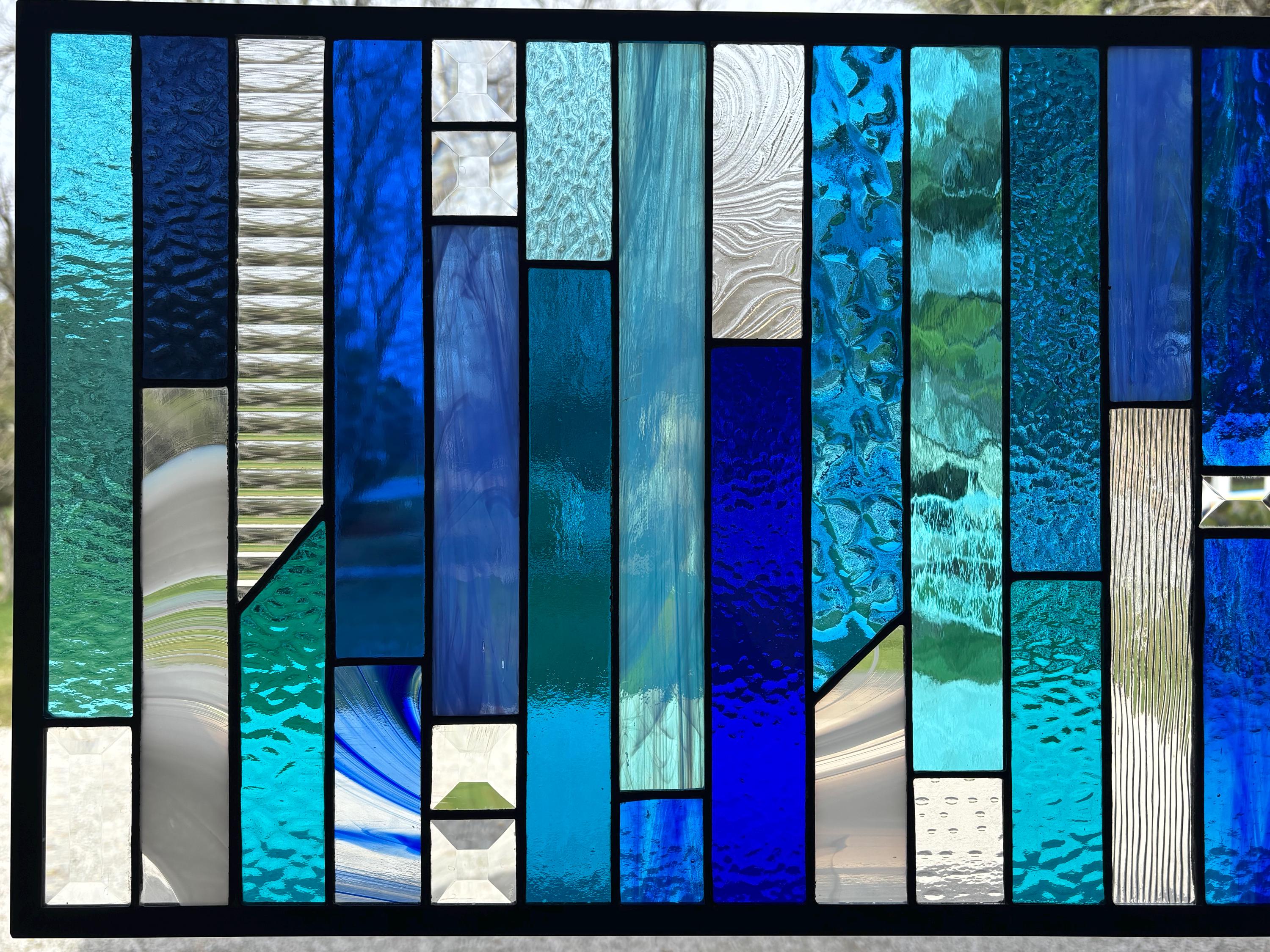 Geometric stained glass panel featuring a vertical layout of layered blues, aquas, and clear textured glass. The varied tones and textures create depth and movement, while select bevel accents catch and refract light for added brightness. A clean, modern composition that works well in both contemporary and transitional spaces. Handmade in Ohio by Honey Dew Glass using the Tiffany copper foil method.