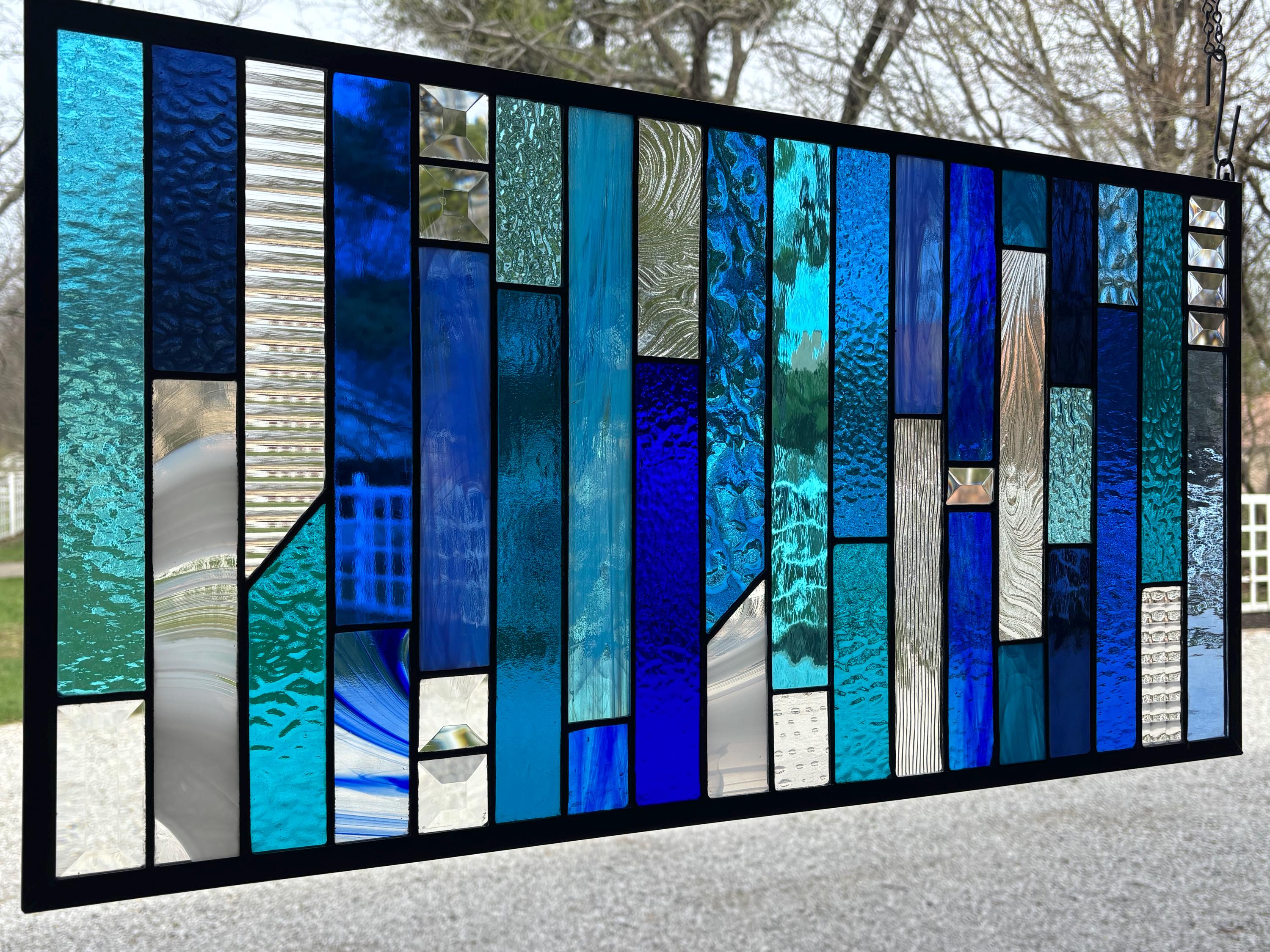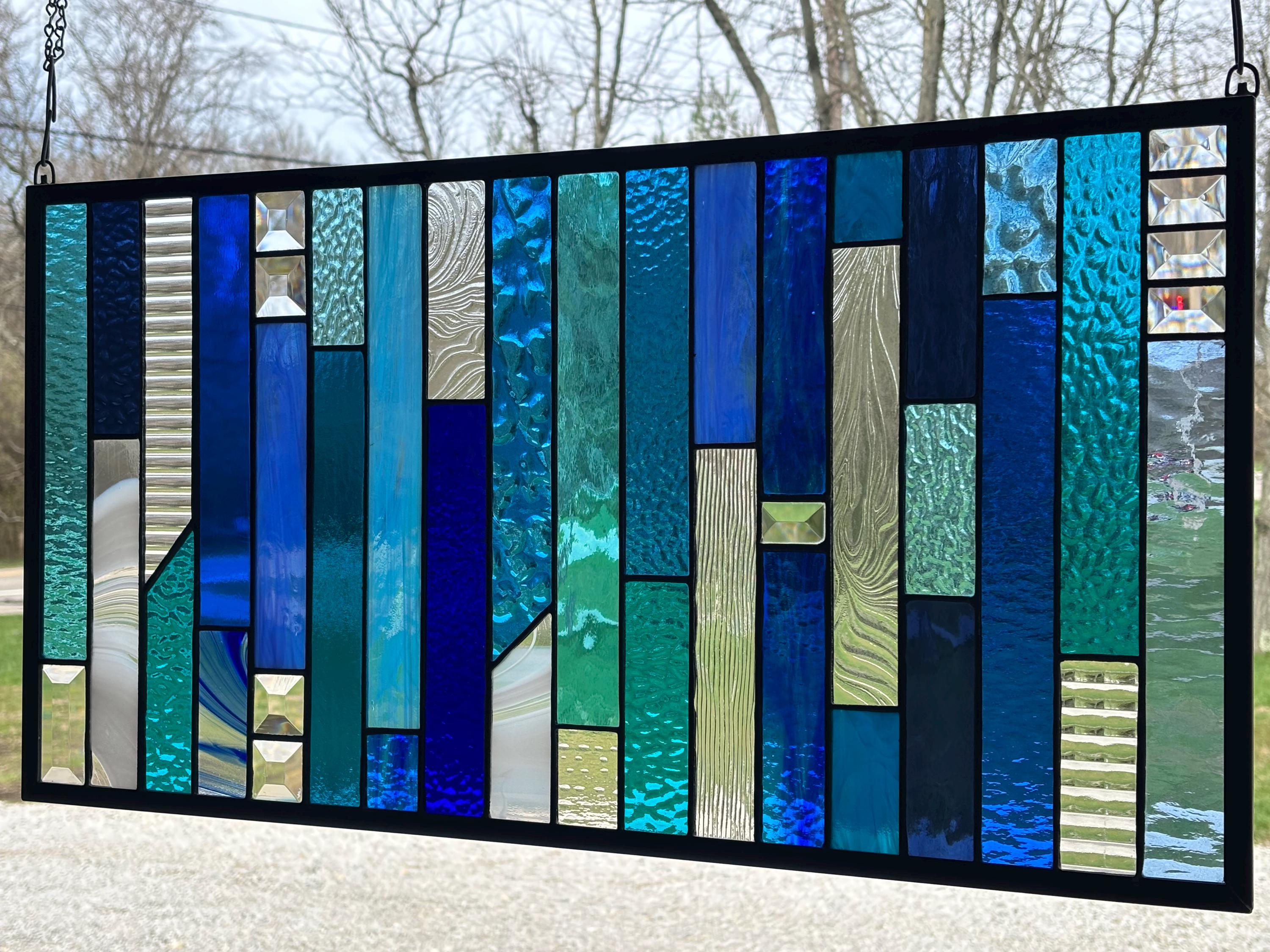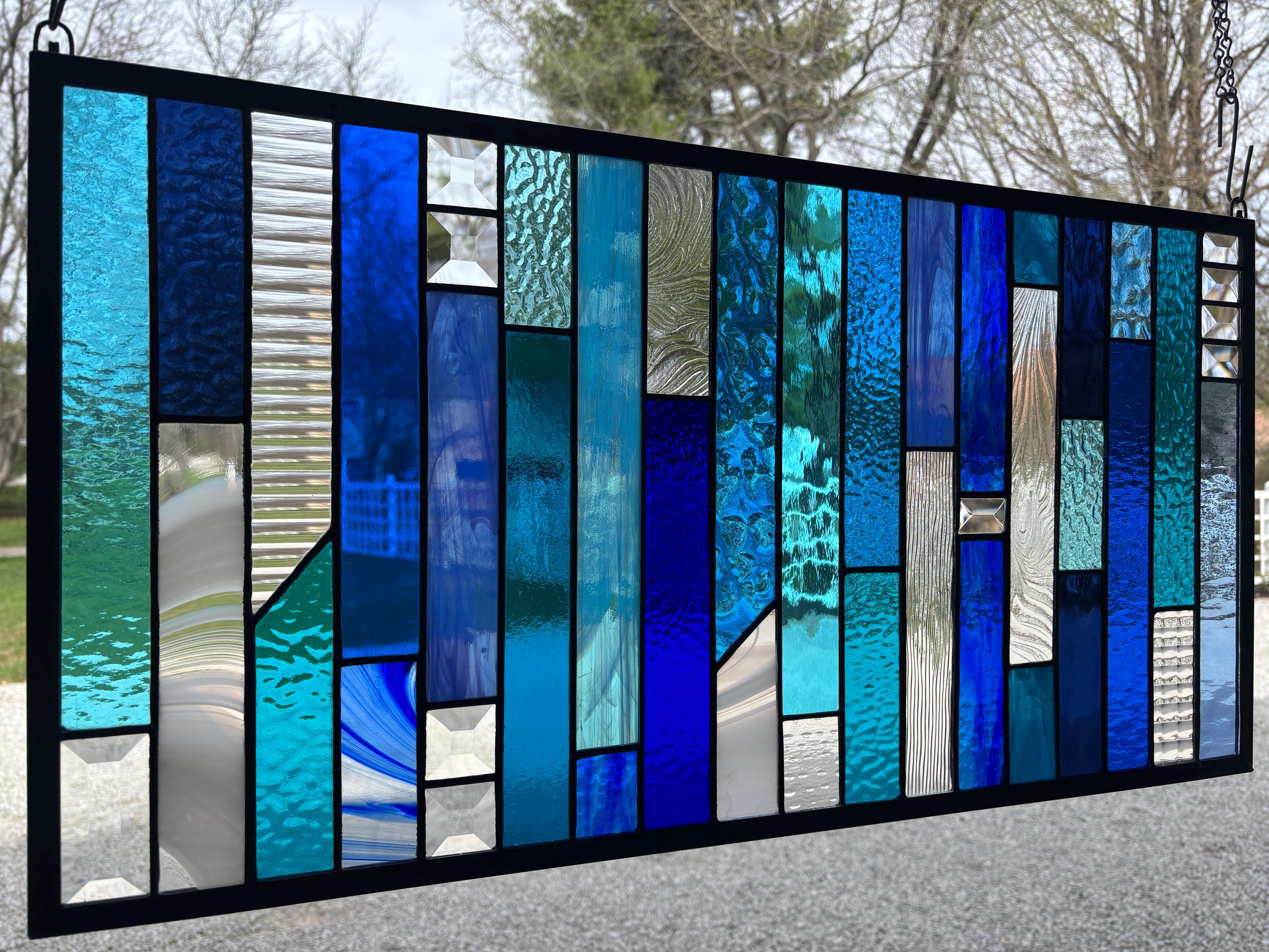 Geometric stained glass panel featuring a vertical layout of layered blues, aquas, and clear textured glass. The varied tones and textures create depth and movement, while select bevel accents catch and refract light for added brightness. A clean, modern composition that works well in both contemporary and transitional spaces. Handmade in Ohio by Honey Dew Glass using the Tiffany copper foil method.