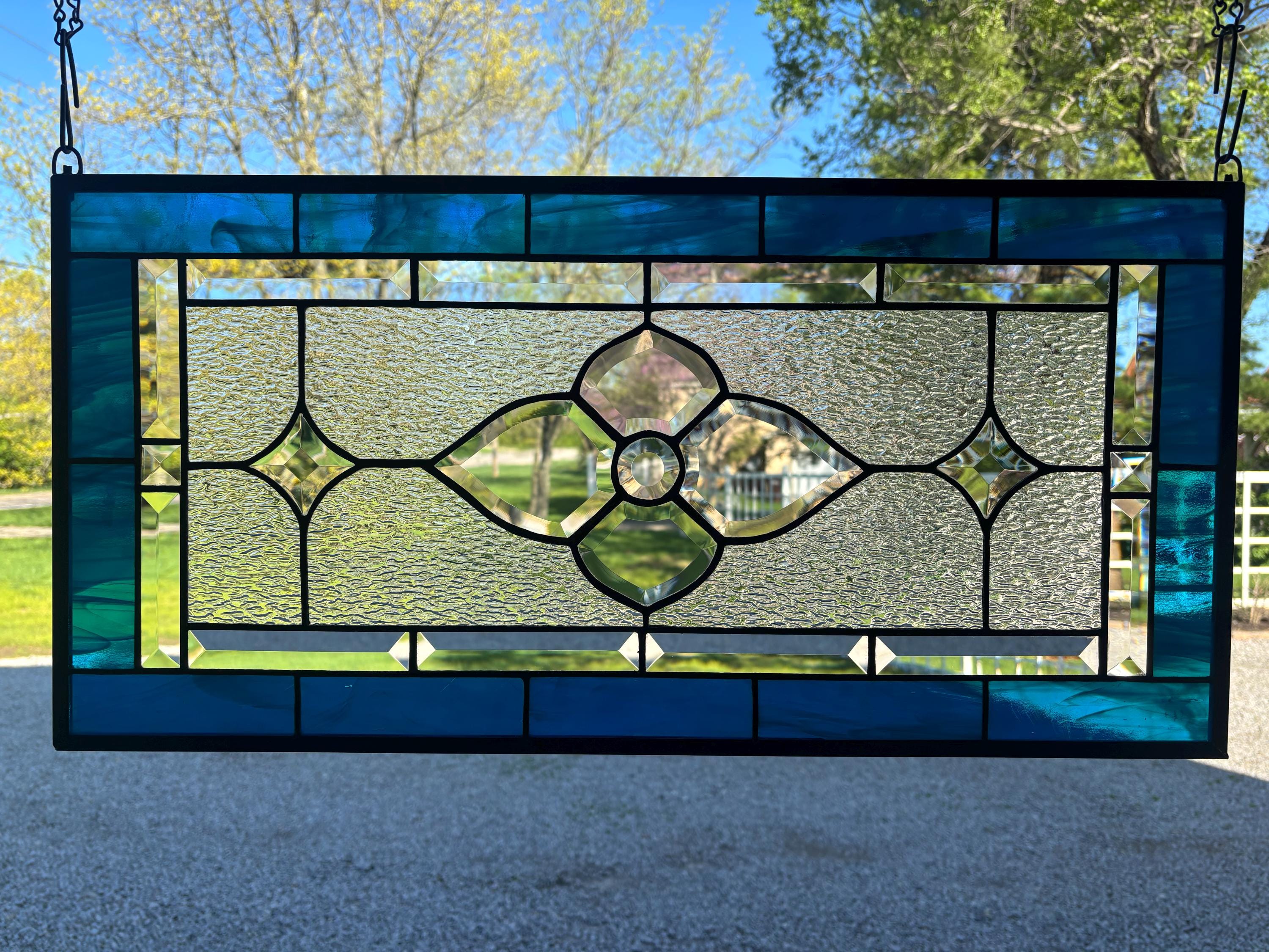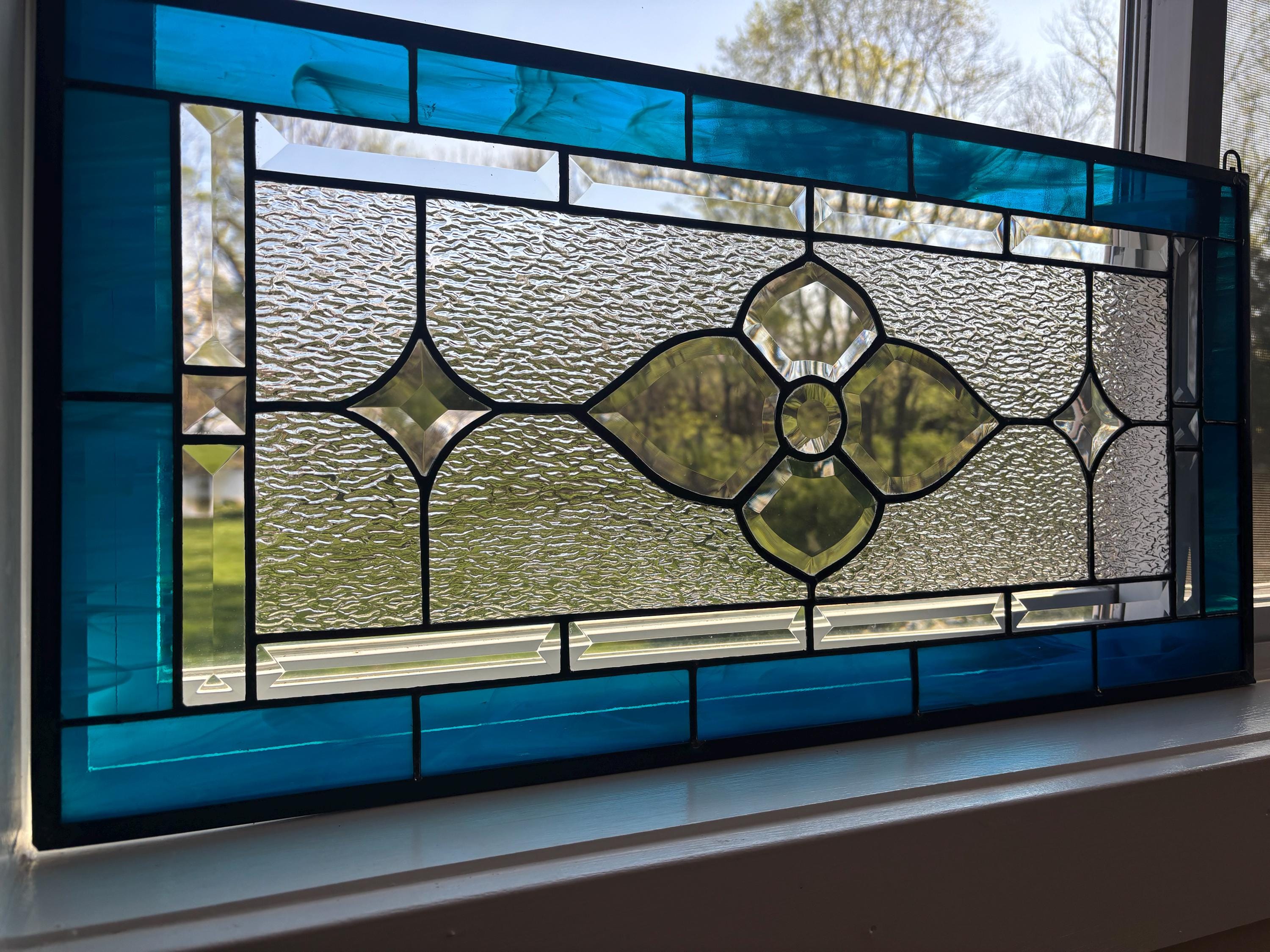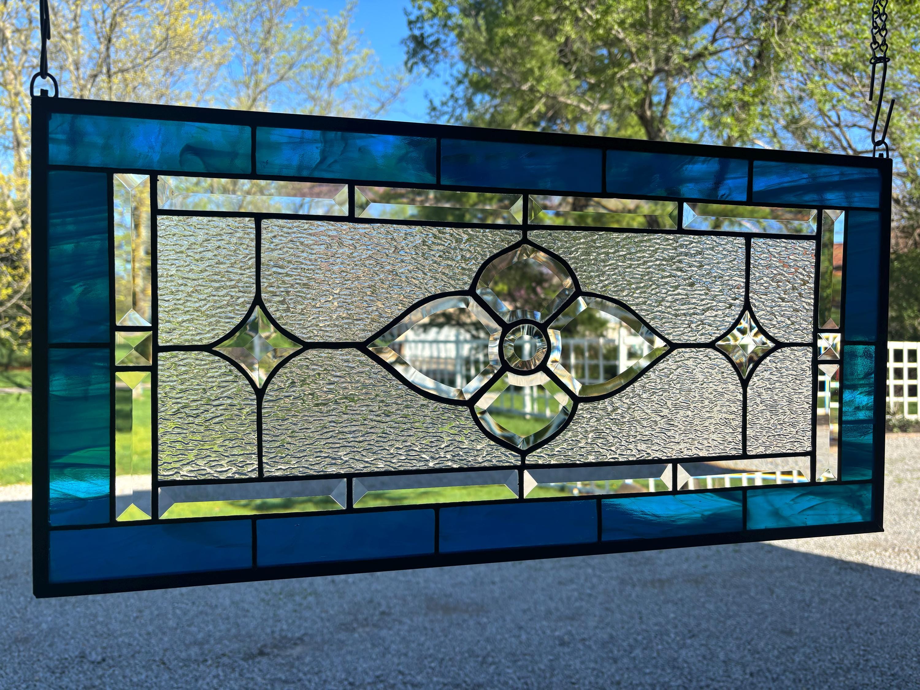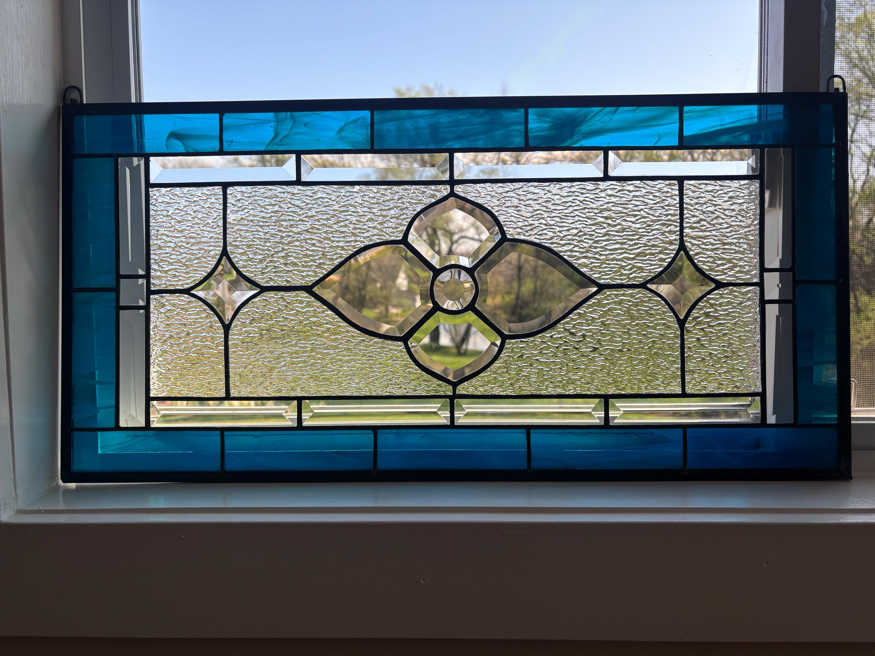 Handmade stained glass panel in dark aqua and clear granite bevels. 12.5” x 25.5”.