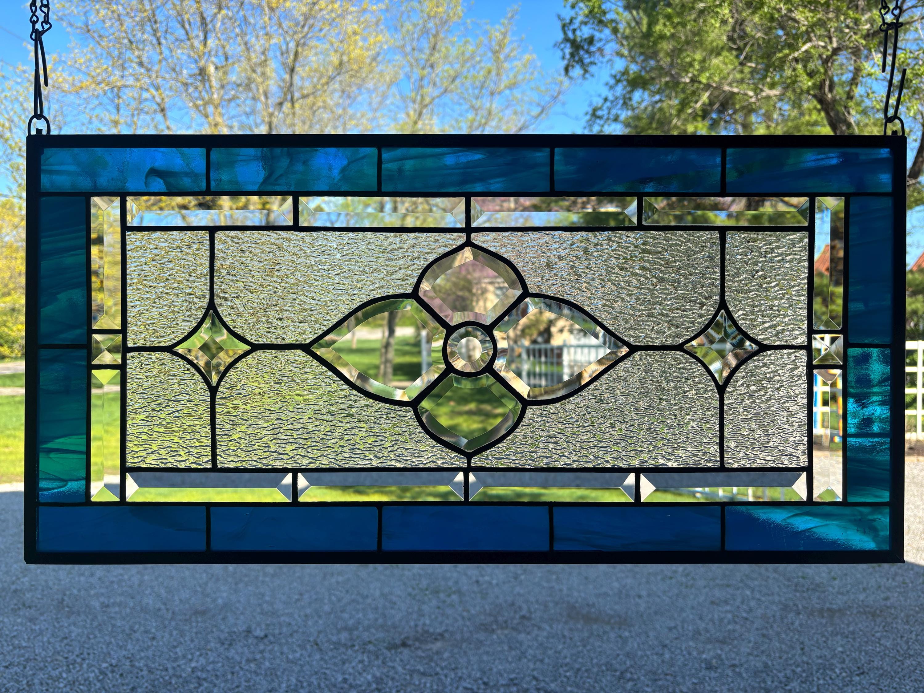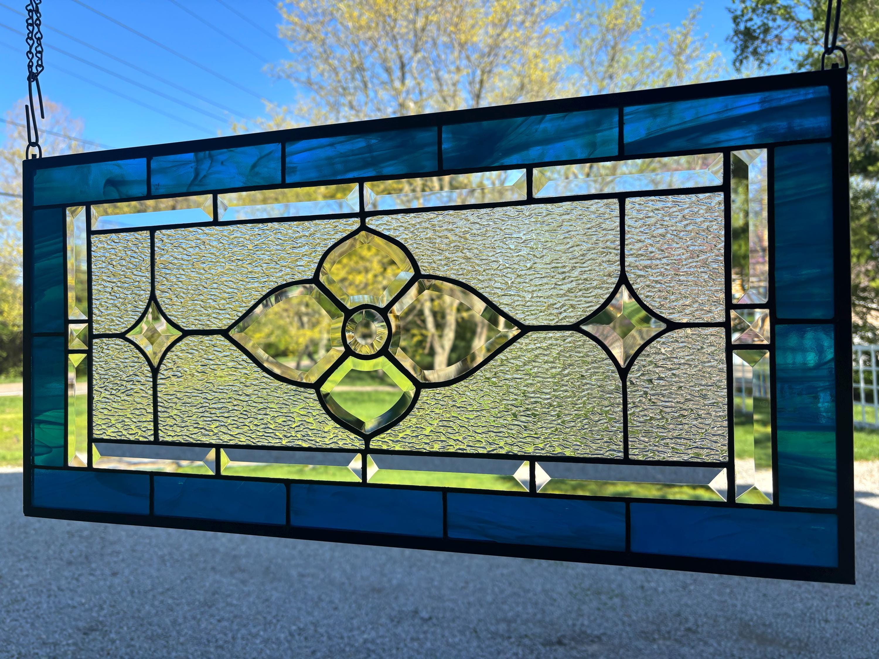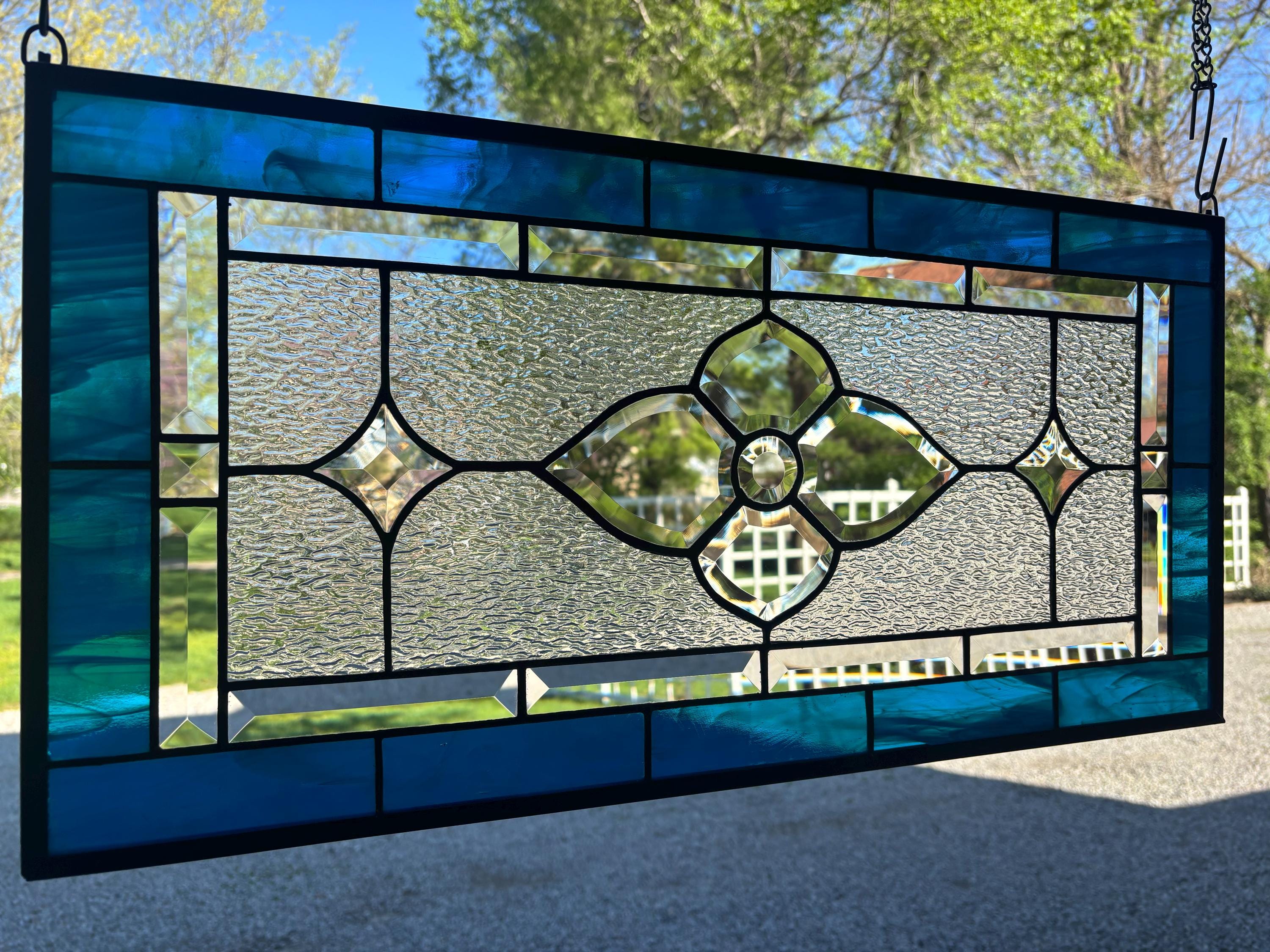 Handmade stained glass panel in dark aqua and clear granite bevels. 12.5” x 25.5”.