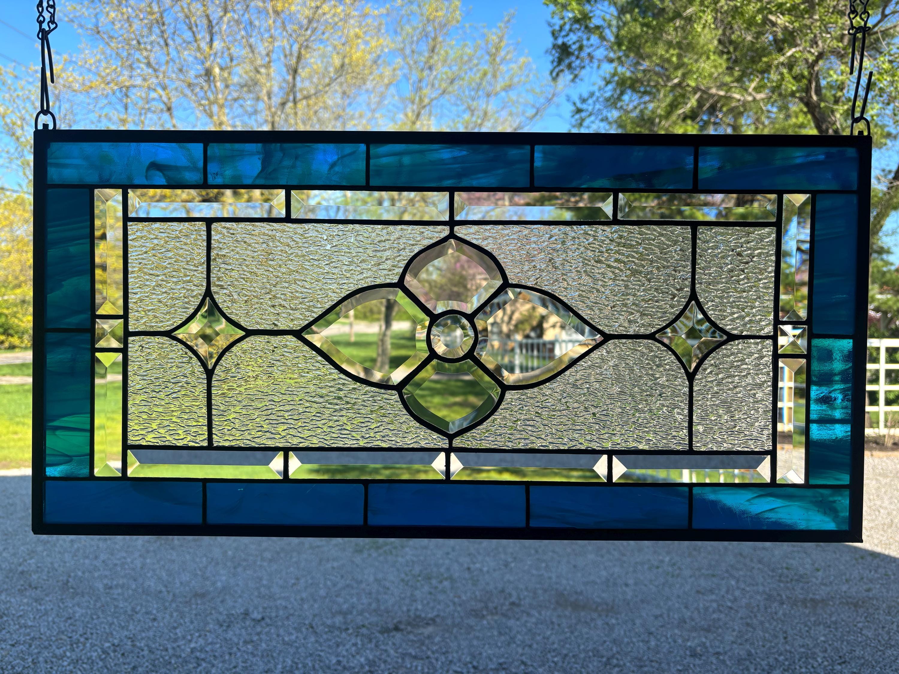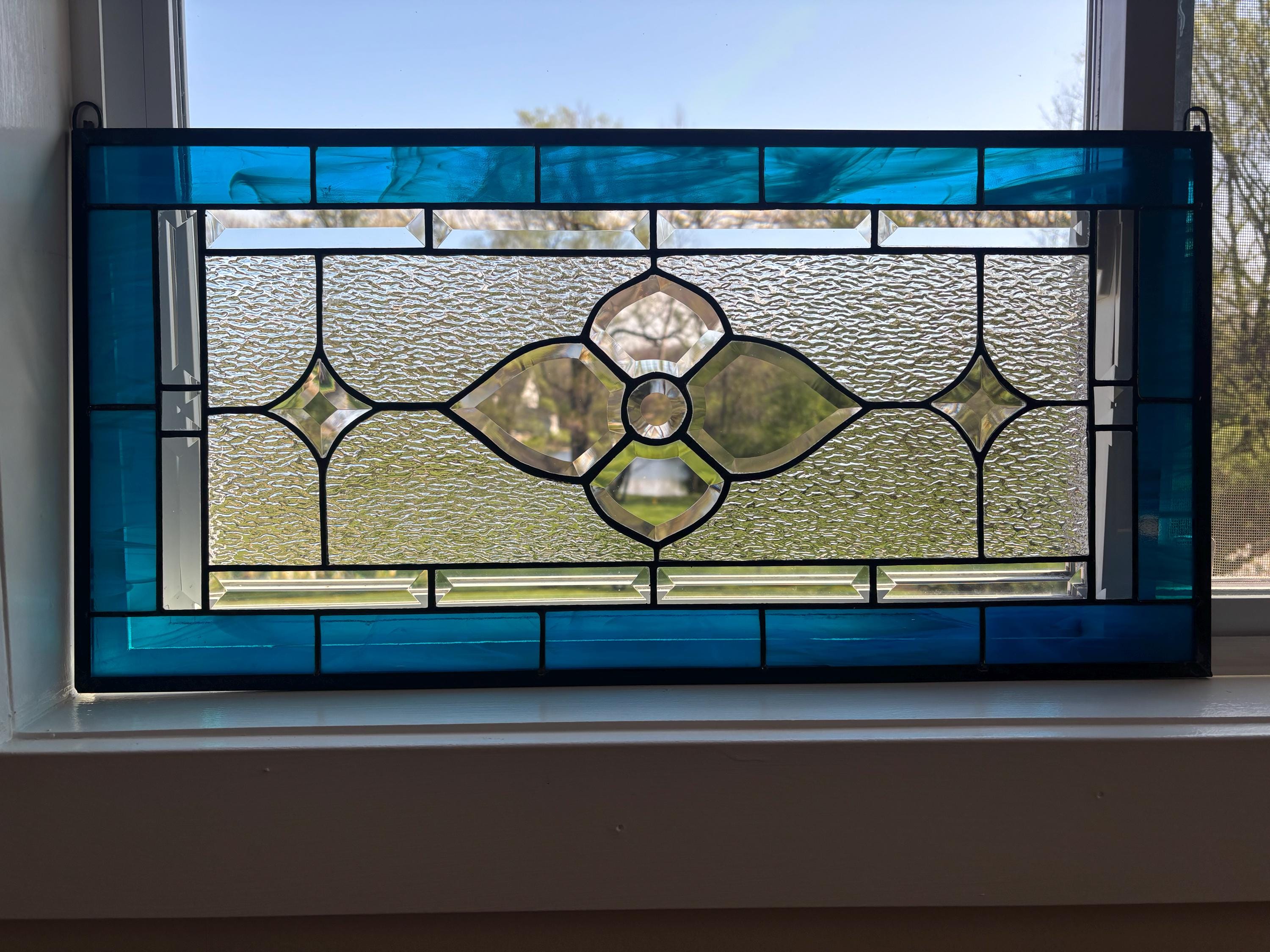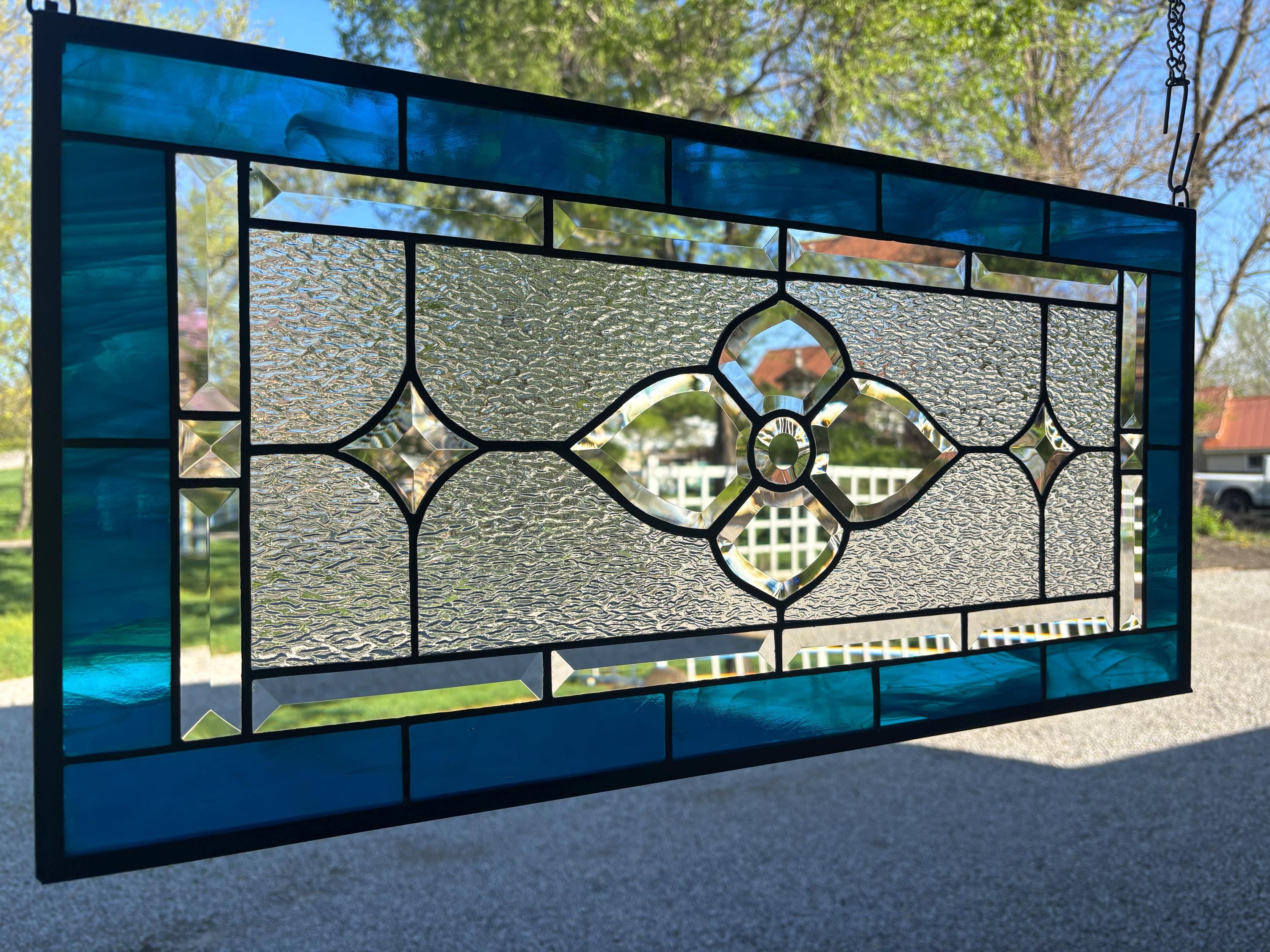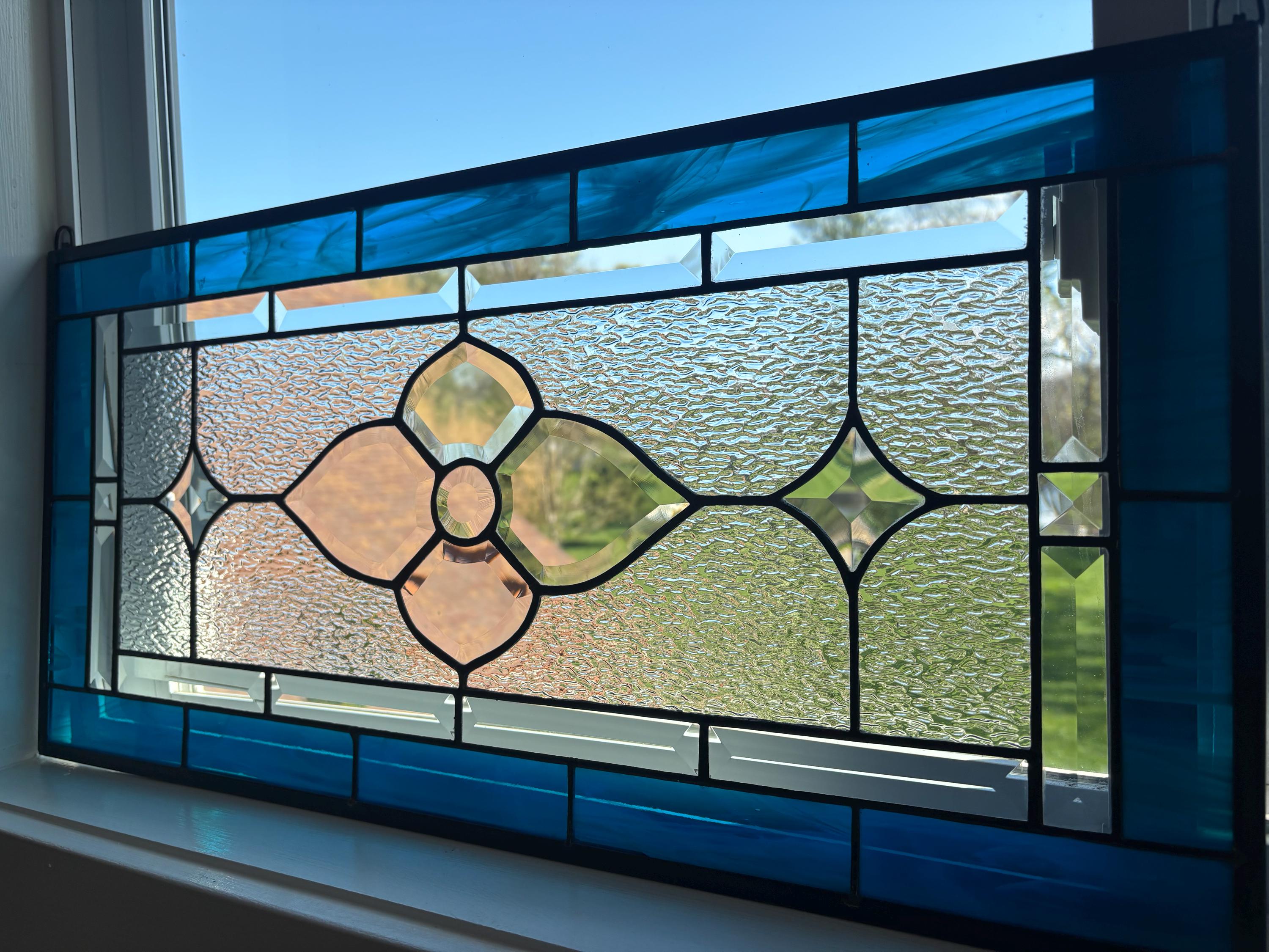 Handmade stained glass panel in dark aqua and clear granite bevels. 12.5” x 25.5”.