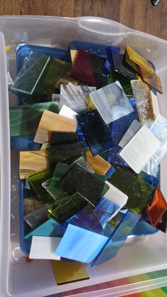 Includes glass in various shapes and sizes cut from Spectrum, Oceanside, Van Gogh, Wissmach, Kokomo, and Youghiogheny. Glass variety may include hammered, wispy, antique, rough rolled, textured, baroque, water glass, iridized and more.